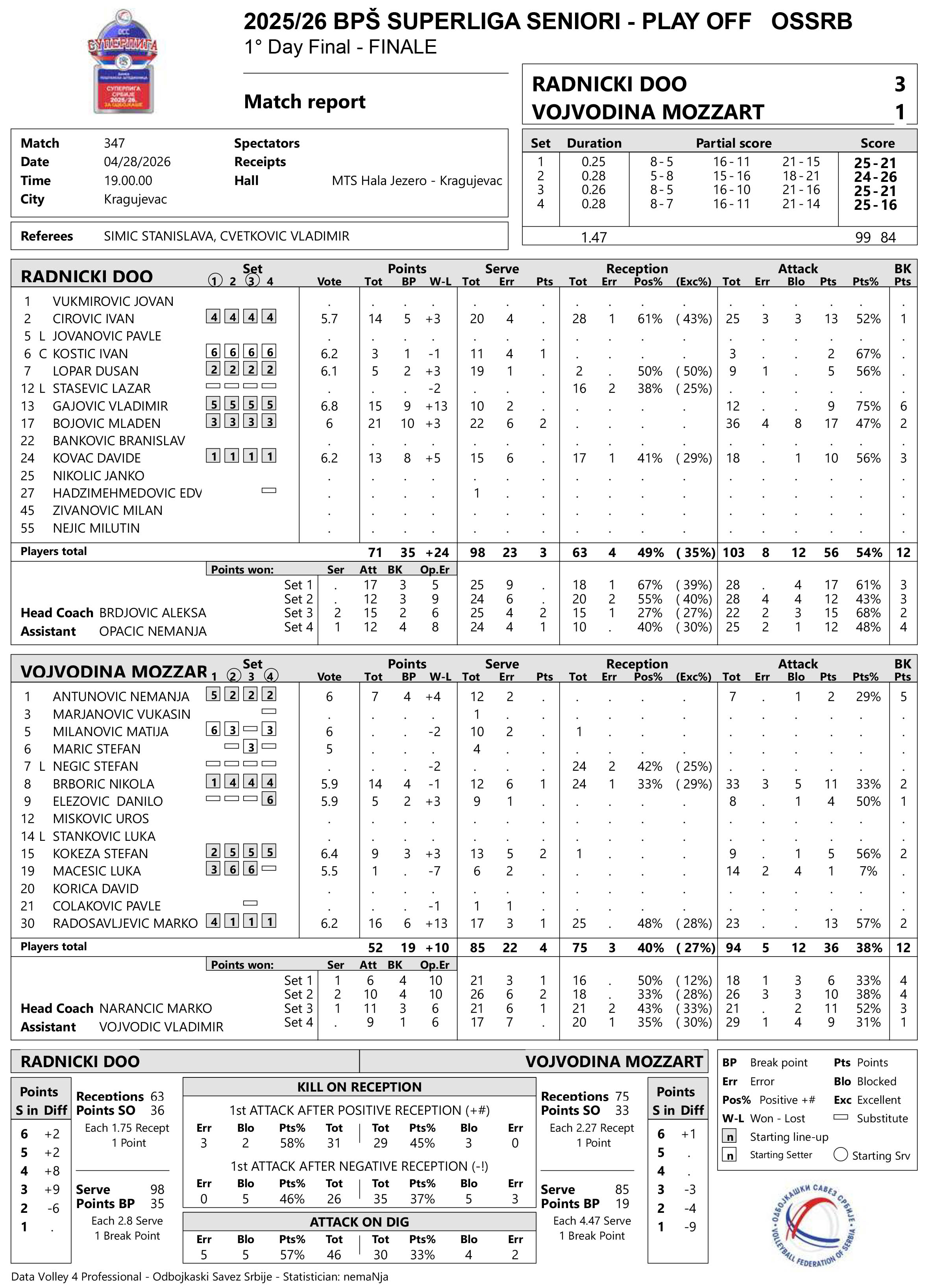 Odbojkaši Radničkog doo iz Kragujevca, aktuelmi prvaci Srbije, poveli su sa 1:0 u finalu plej – ofa za prvaka Banka Poštanska štedionica Superlige 2025/2026. Radnički doo je u „MTS hali Jezero“ u Kragujevcu, u prvom meču finala plej-ofa savladao Vojvodinu Mozzart iz Novog Sada sa 3:1, po setovima 25:21, 24:26, 25:21 i 25:16, posle 107 minuta igre.