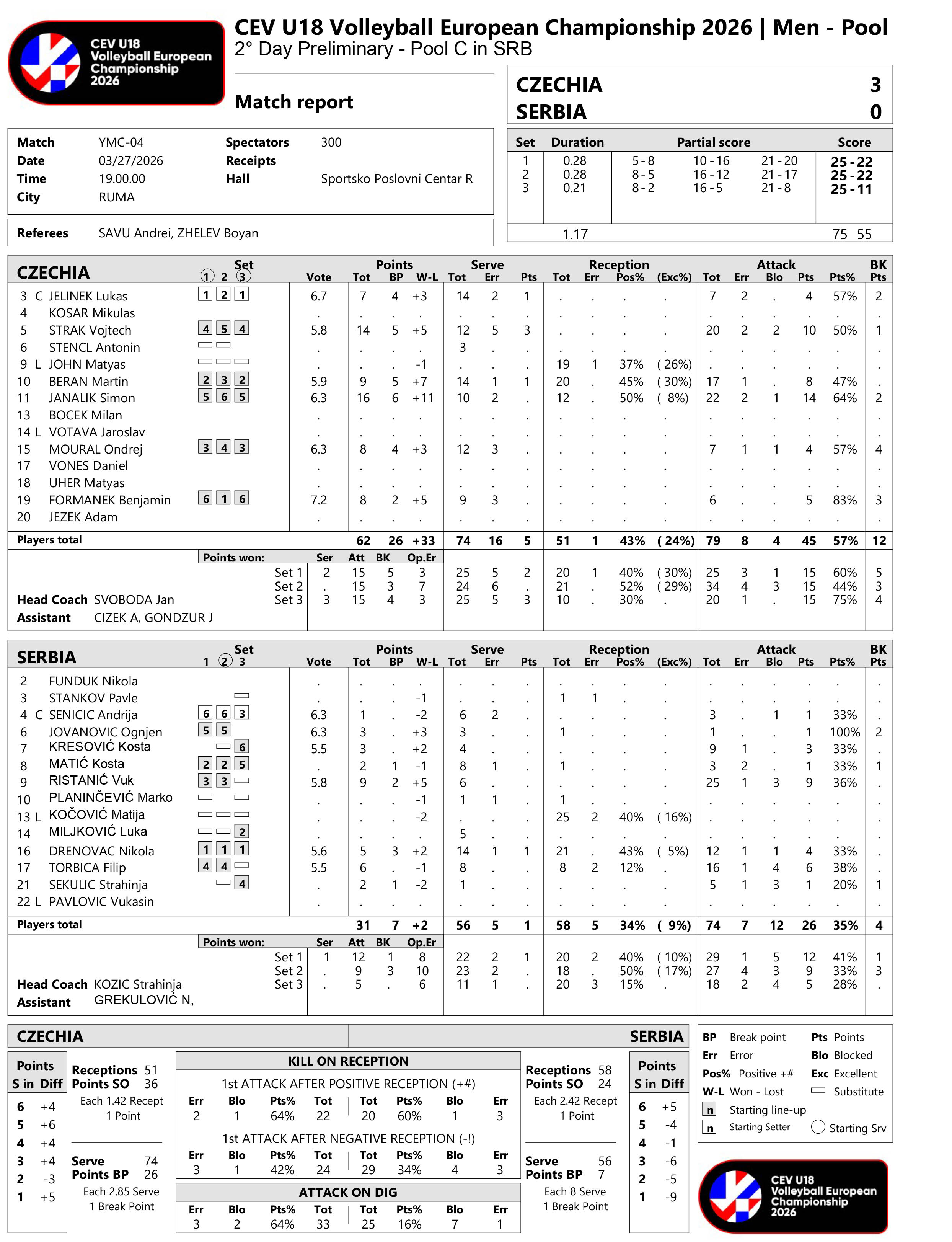SRBIJA – ČEŠKA 0:3 (22:25, 22:25, 11:25)