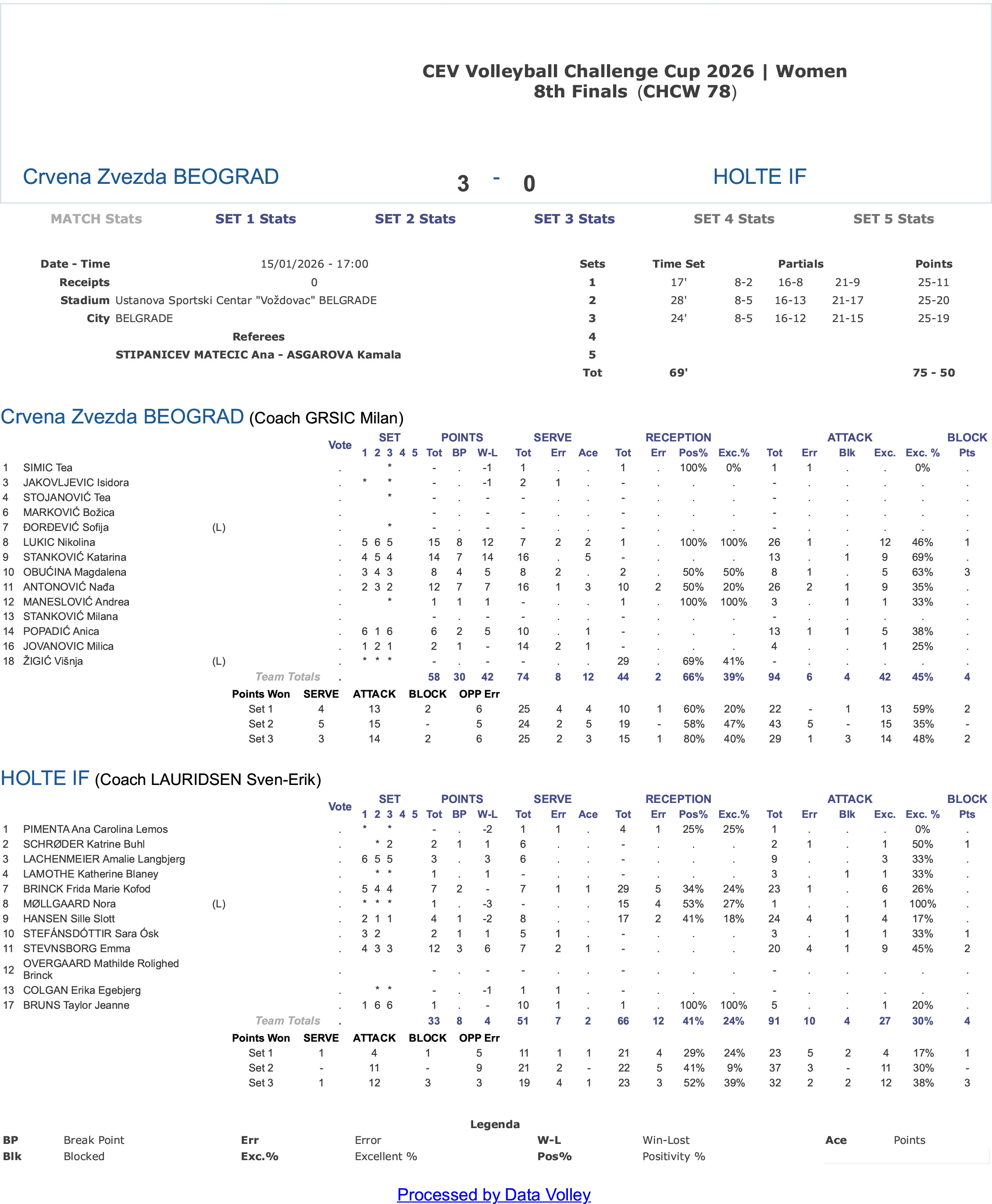U prvom meču, odigranom u Danskoj, Crvena zvezda je slavila sa 3:1 (25:17, 24:26, 25:15, 25:23).