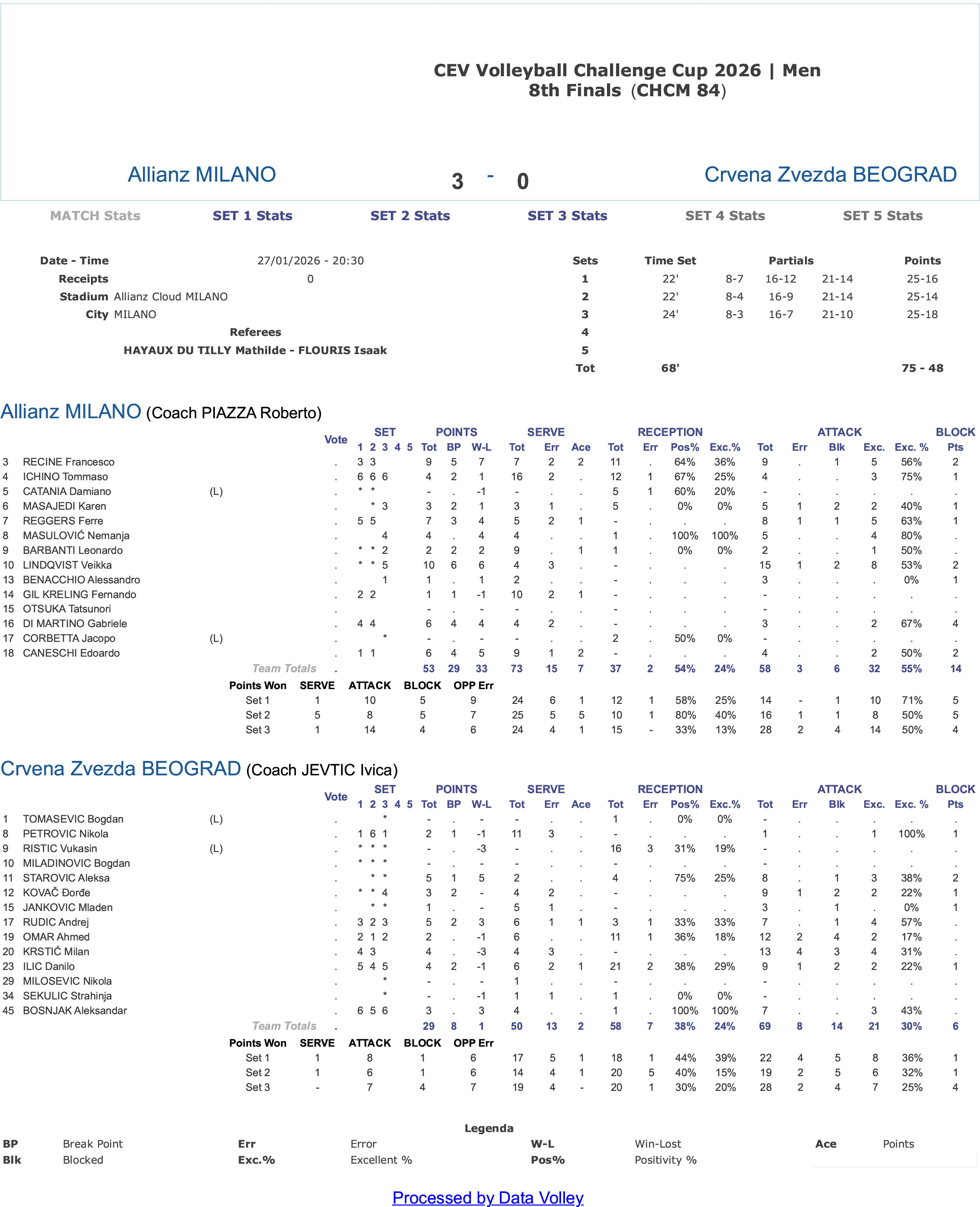 Pobednik duela Crvena zvezda – Alijanc Milano igraće u četvrtfinalu (11. i 18. februar) protiv pobednika dvomeča između španske Valensije i poljske Čestohove, koju sa klupe predvodi Ljuba Travica. U prvom meču, odigranom u Španiji, Čestohova je pobedila sa 3:0 (25:20, 25:22, 25:22). Revanš će se odigrati u četvrtak, 29. januara od 20.30 časova u Poljskoj.