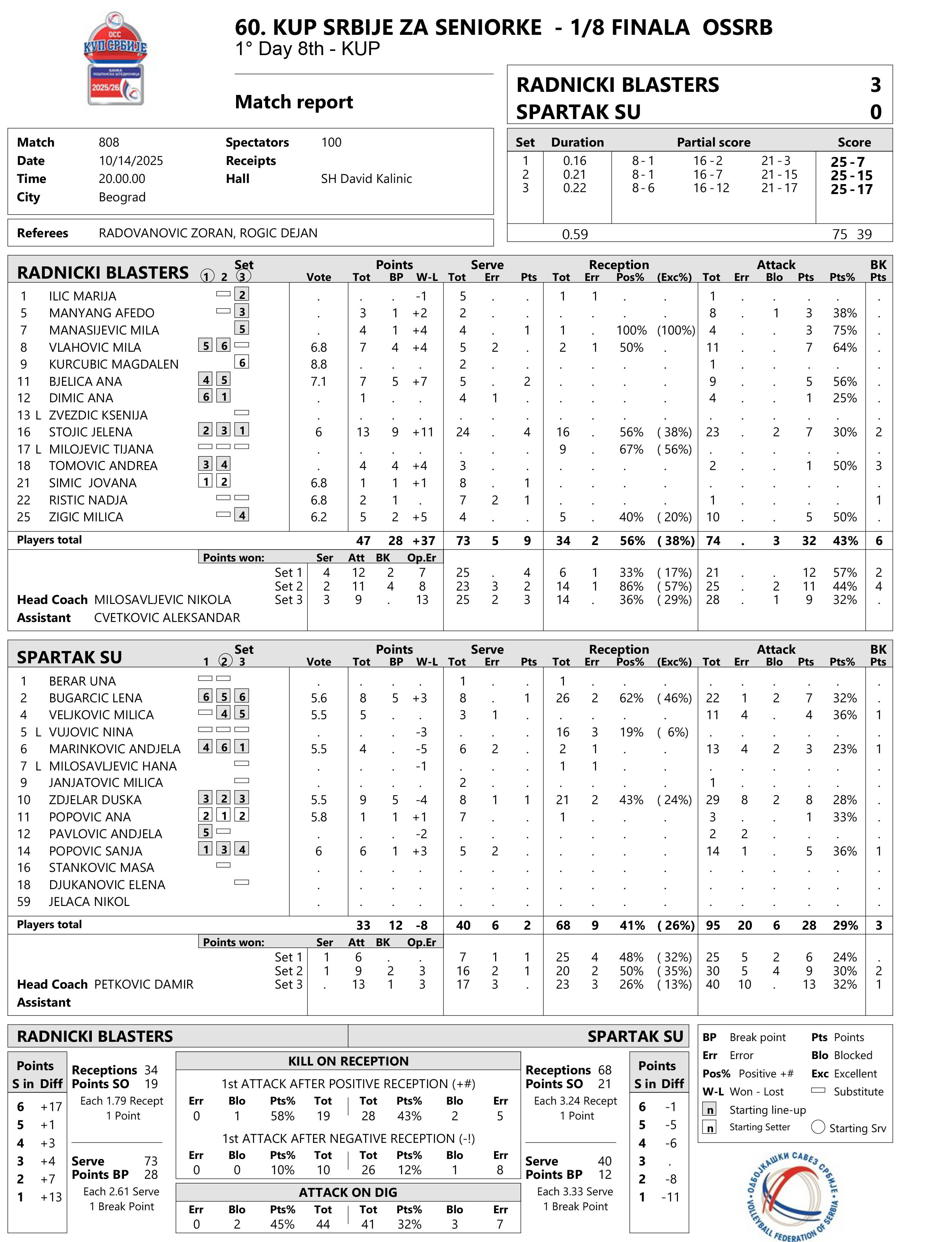 RADNIČKI BLASTERS (BEOGRAD) – SPARTAK (SUBOTICA) 3:0 (25:7, 25:15, 25:17)