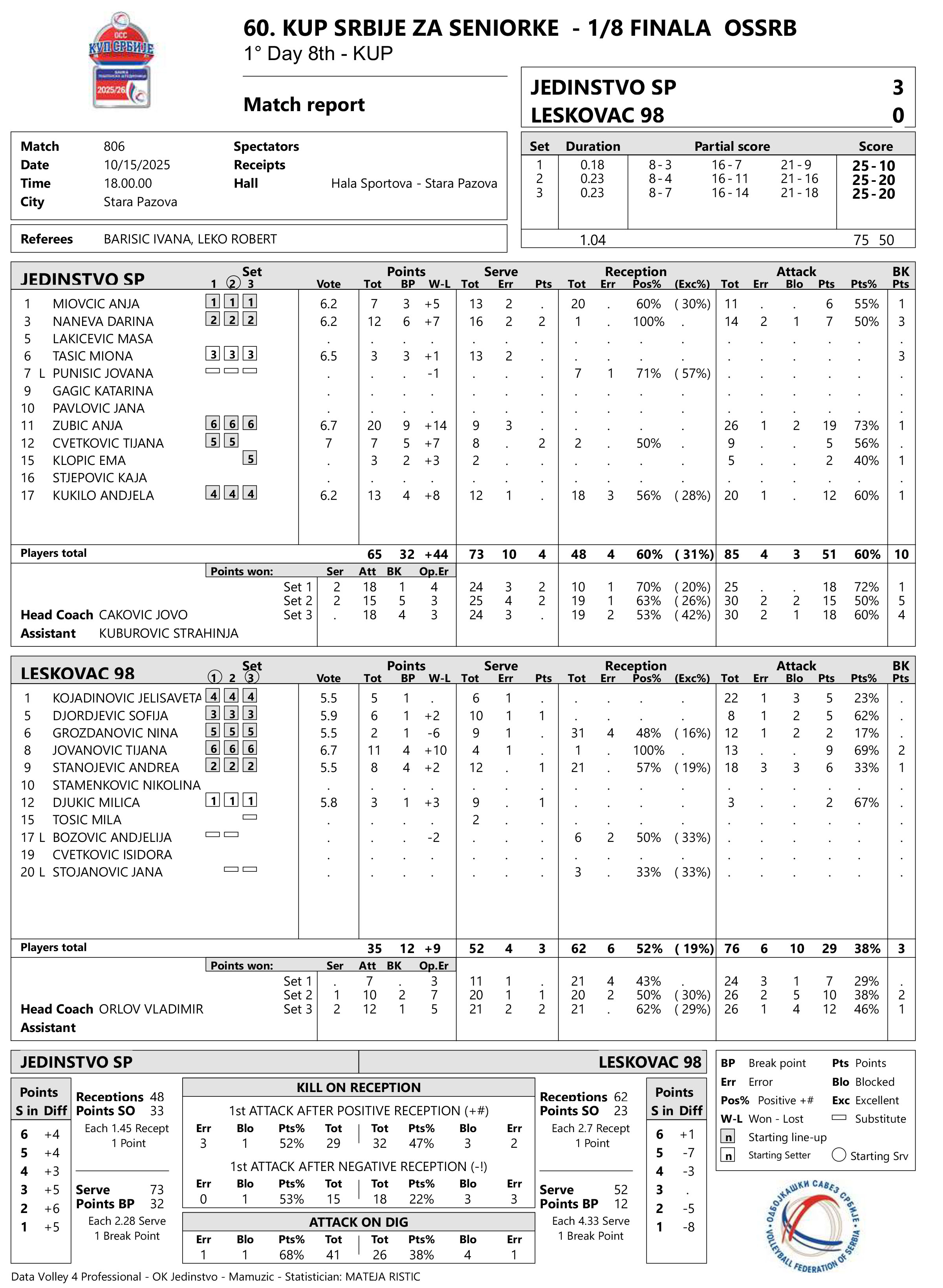 JEDINSTVO (STARA PAZOVA) – LESKOVAC 98 3:0 (25:10, 25:20, 25:20)