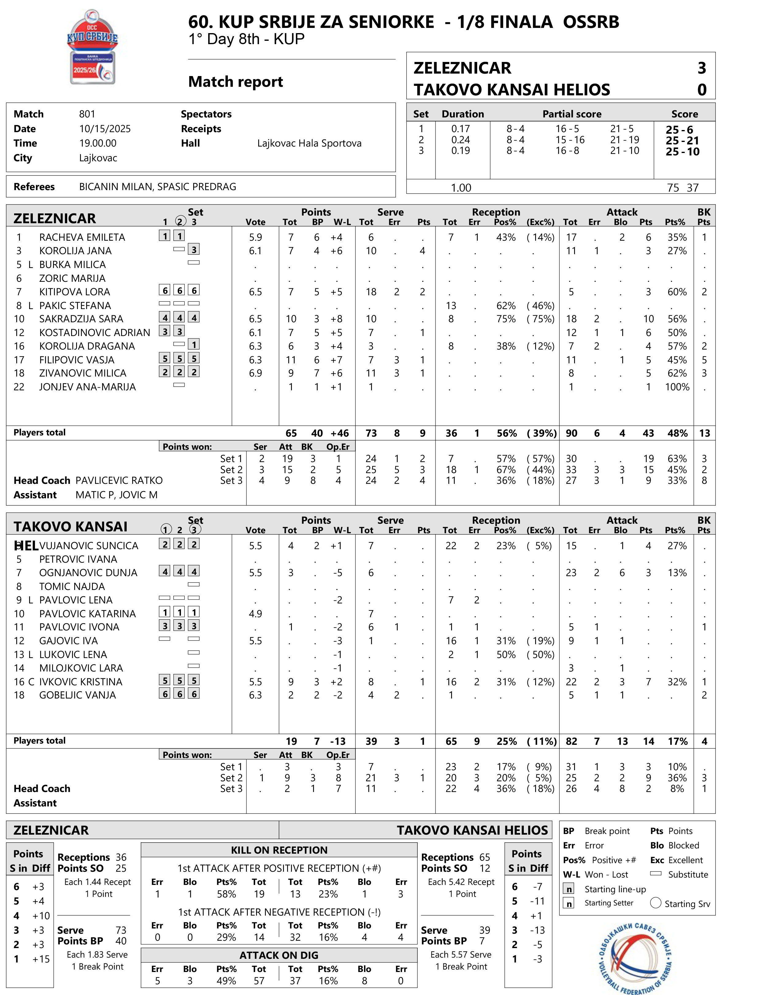 ŽELEZNIČAR (LAJKOVAC) – TAKOVO KANSAI HELIOS (GORNJI MILANOVAC) 3:0 (25:6, 25:21, 25:10)