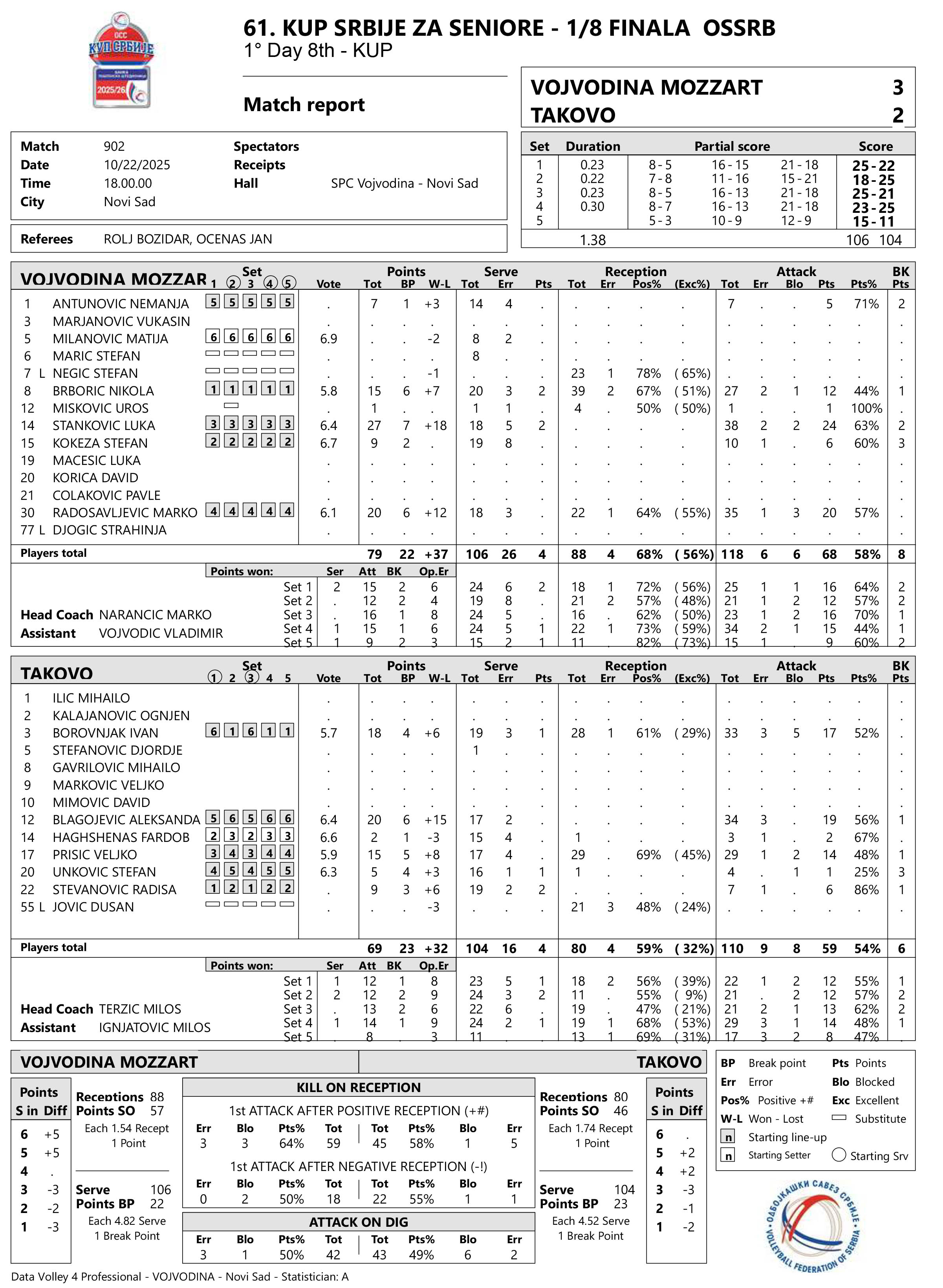 VOJVODINA MOZZART (NOVI SAD) – TAKOVO (GORNJI MILANOVAC) 3:2 (25:22, 18:25, 25:21, 23:25, 15:11)
