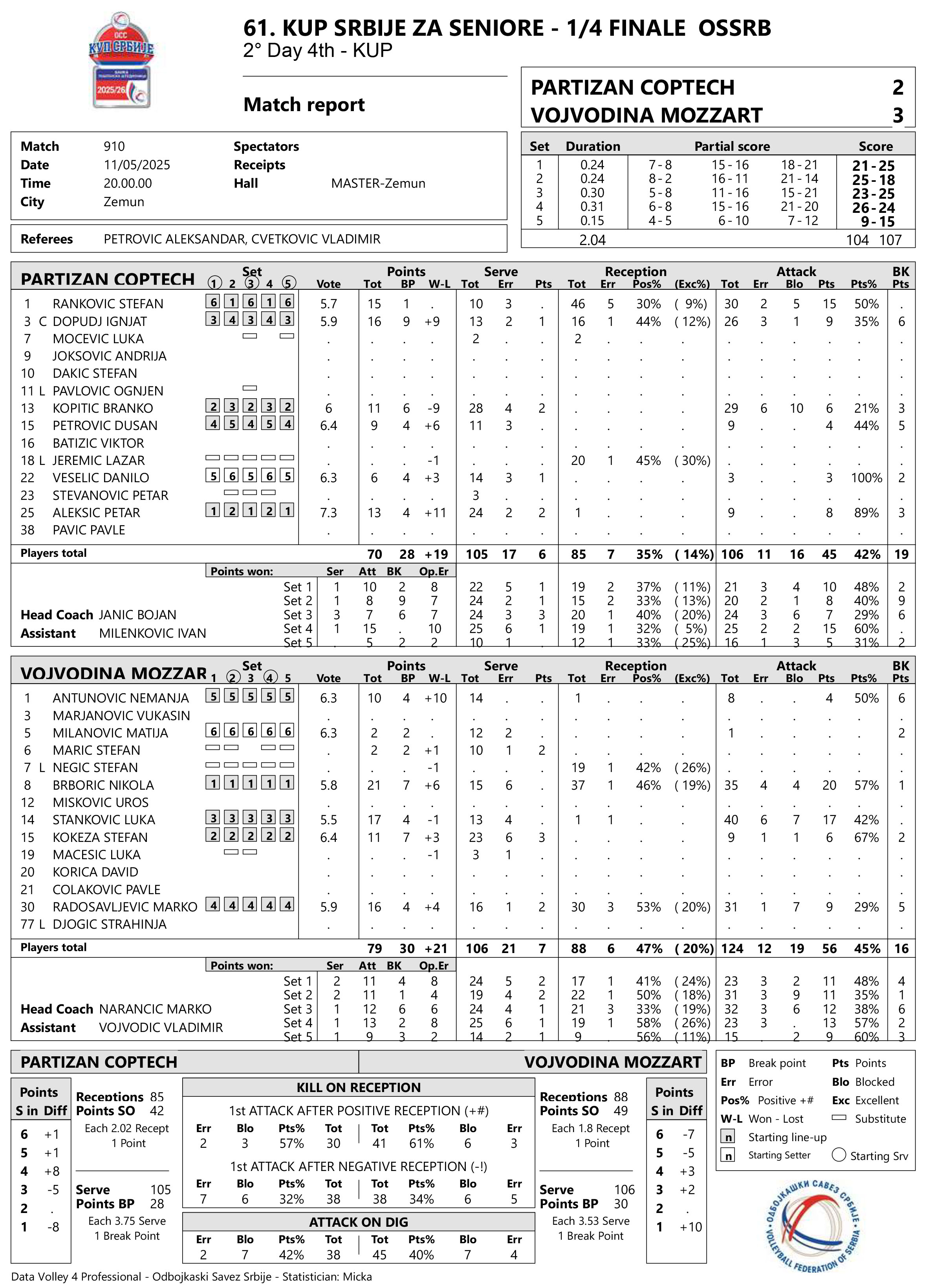 PARTIZAN COPTECH – VOJVODINA MOZZART (NOVI SAD) 2:3 (21:25, 25:18, 23:25, 26:24, 9:15)