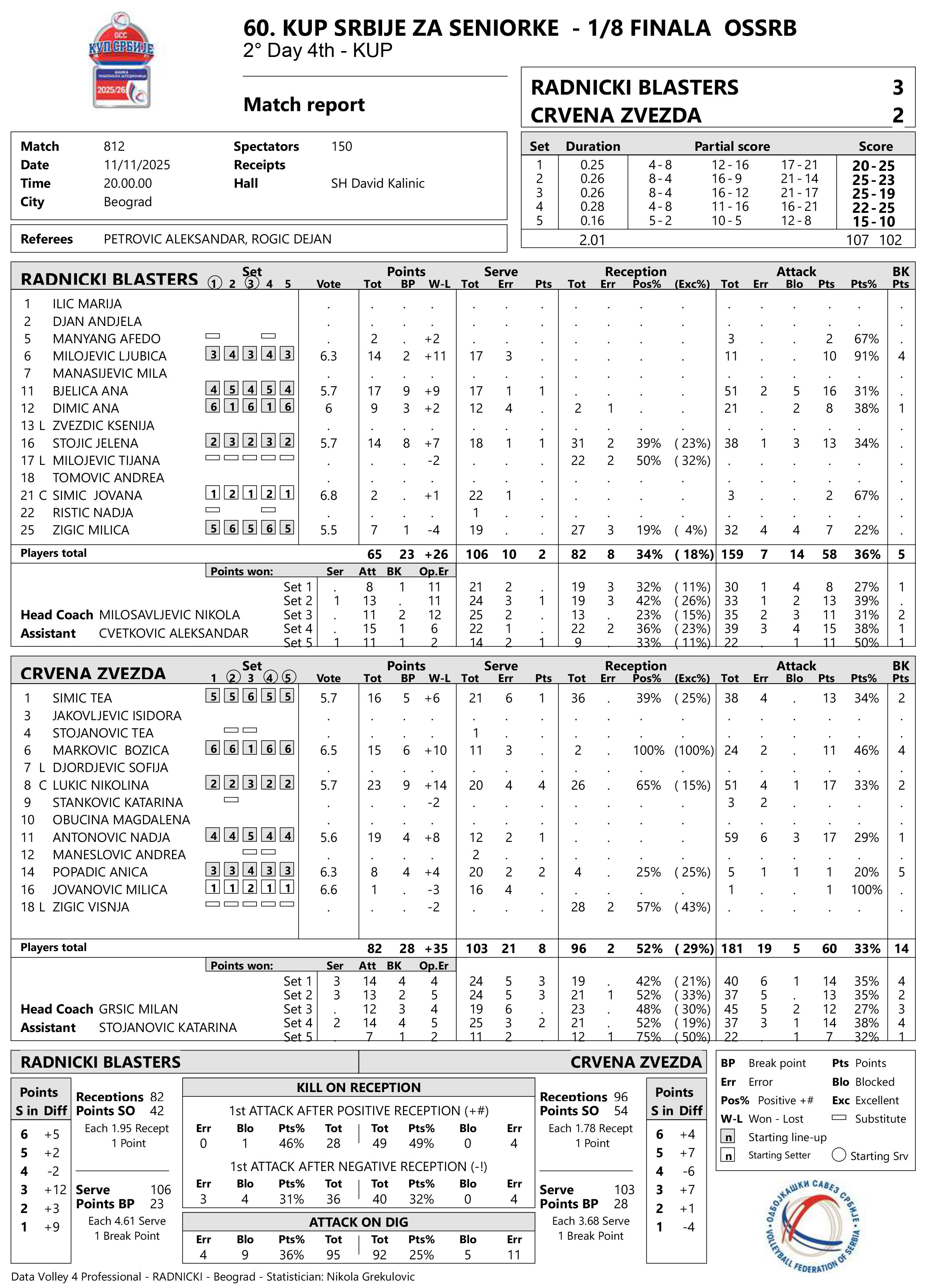 RADNIČKI BLASTERS (BEOGRAD) – CRVENA ZVEZDA 3:2 (20:25, 25:23, 25:19, 22:25, 15:10)