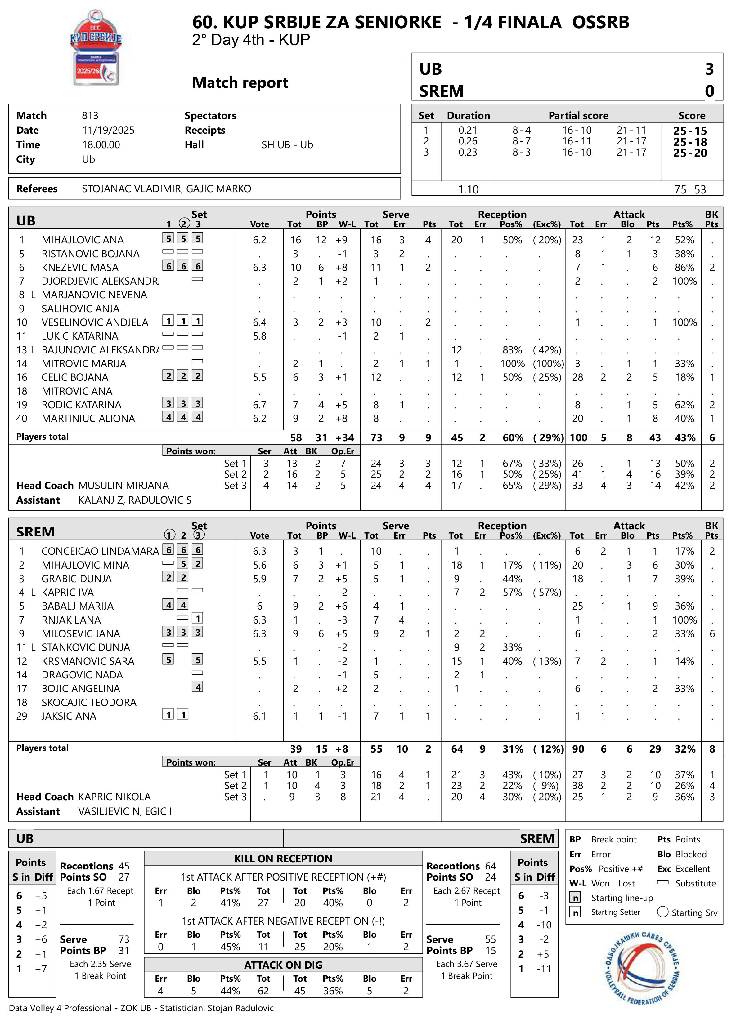 UB – SREM (SREMSKA MITROVICA) 3:0 (25:15, 25:18, 25:20)