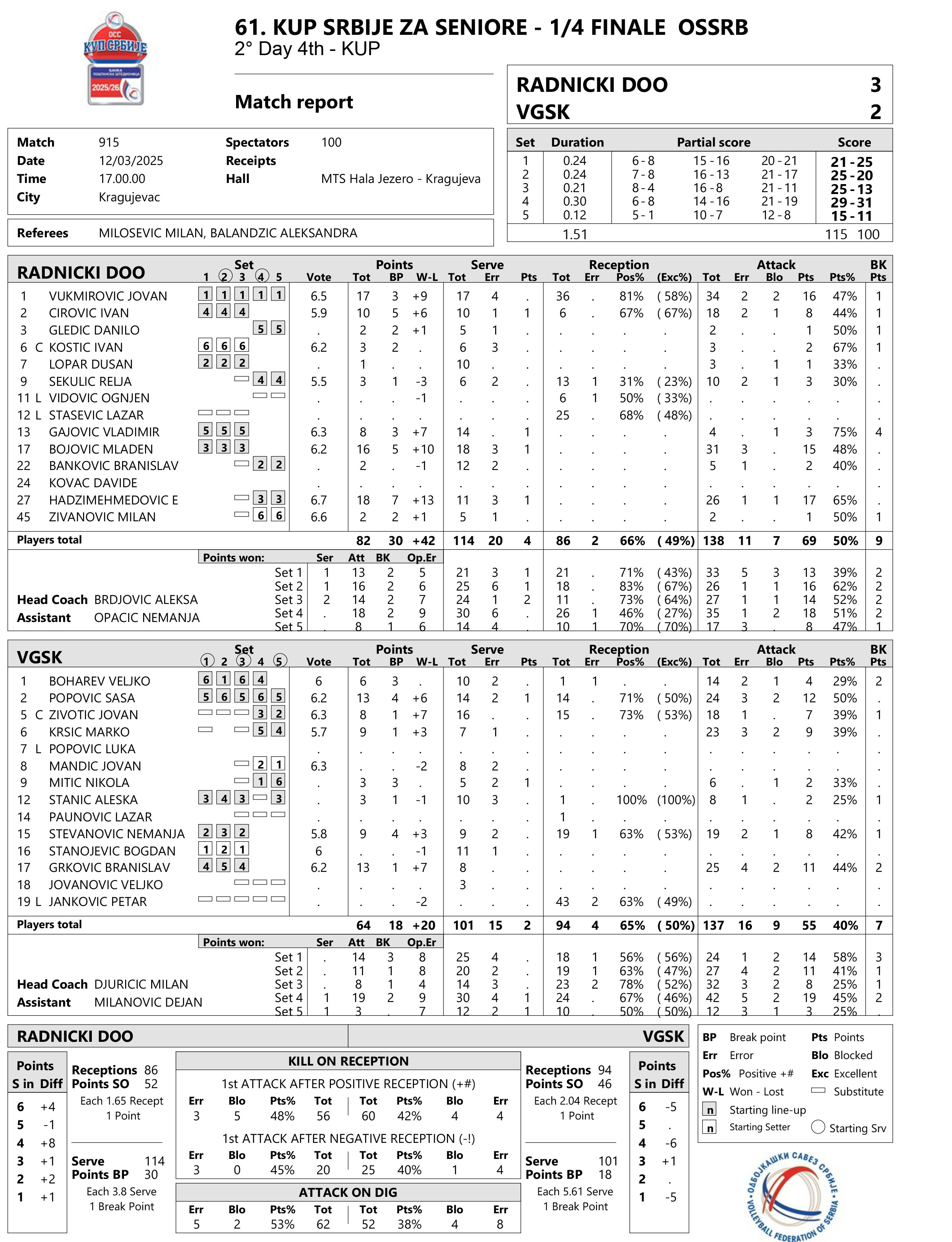 RADNIČKI DOO (KRAGUJEVAC) – VGSK (VELIKO GRADIŠTE) 3:2 (21:25, 25:20, 25:13, 29:31, 15:11)