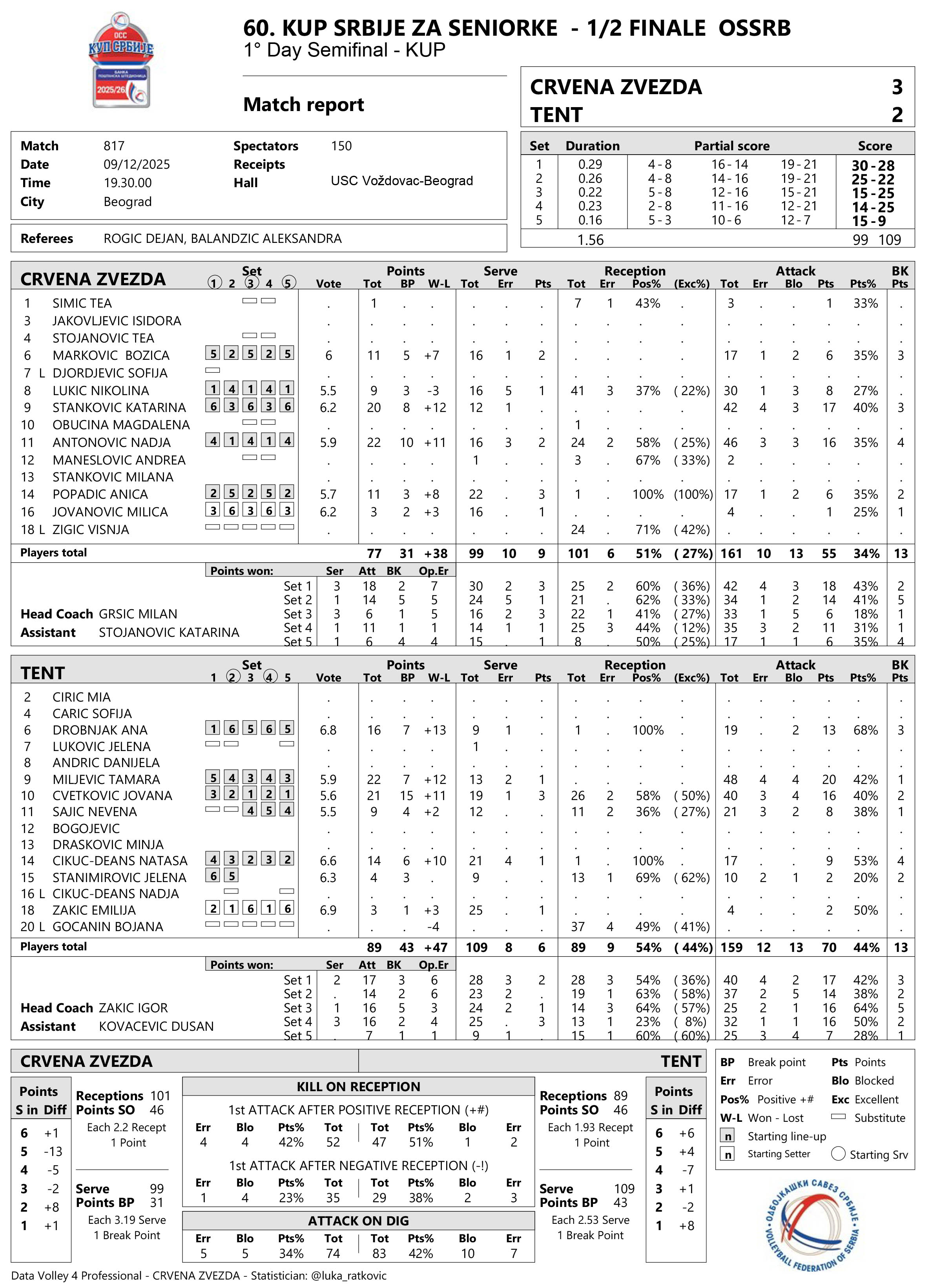CRVENA ZVEZDA – TENT (OBRENOVAC) 3:2 (30:28, 25:22, 15:25, 14:25, 15:9)