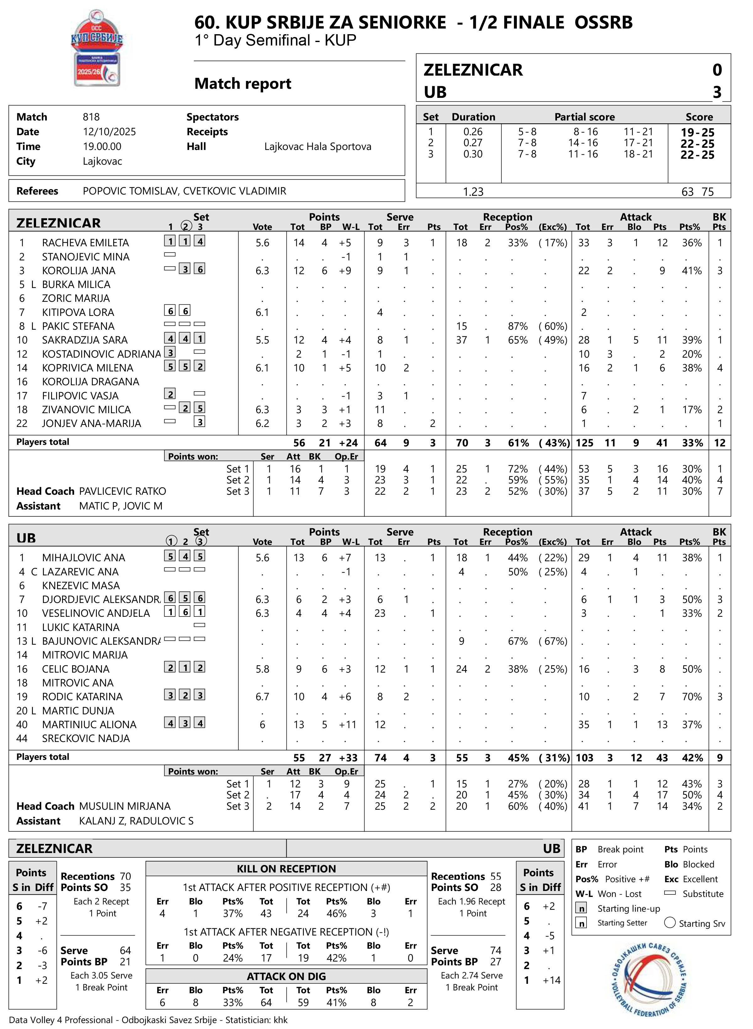 ŽELEZNIČAR (LAJKOVAC) – UB 0:3 (19:25, 22:25, 22:25)