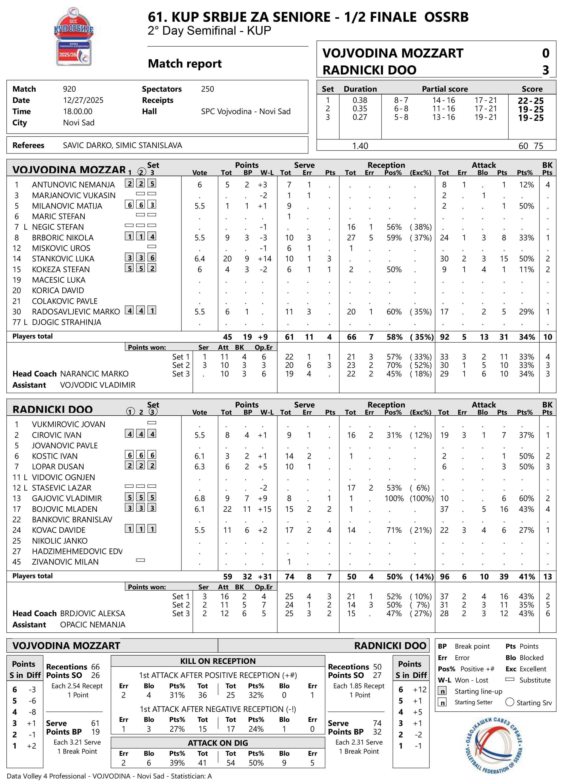 VOJVODINA MOZZART (NOVI SAD) – RADNIČKI DOO (KRAGUJEVAC) 0:3 (22:25, 19:25, 19:25)