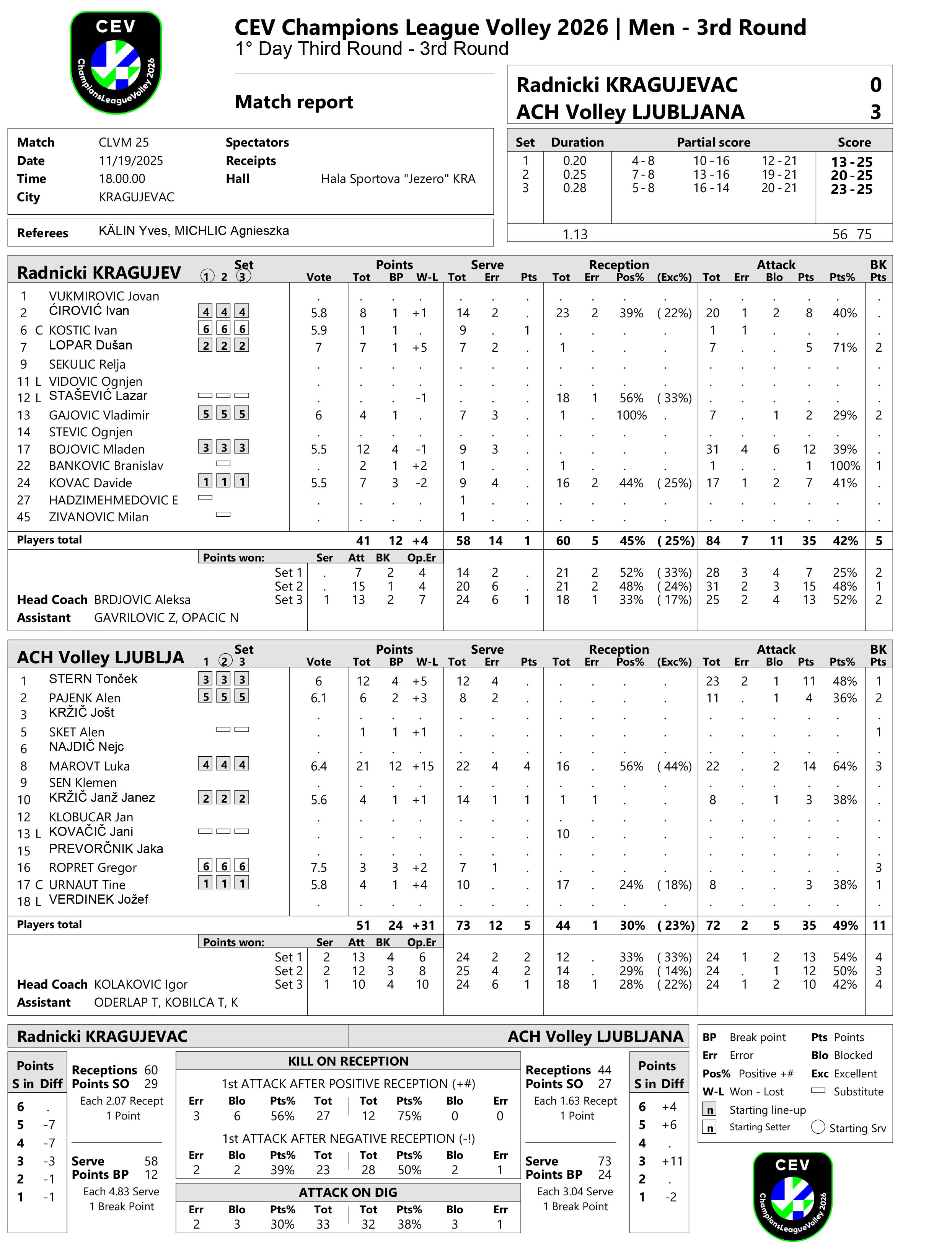 Pobednik dvomeča Radnički doo – ACH Volej Ljubljana igraće u A grupi Lige šampiona 2026. sa italijanskim Trentinom, turskom Zirat bankom iz Ankare i francuskim Turom.