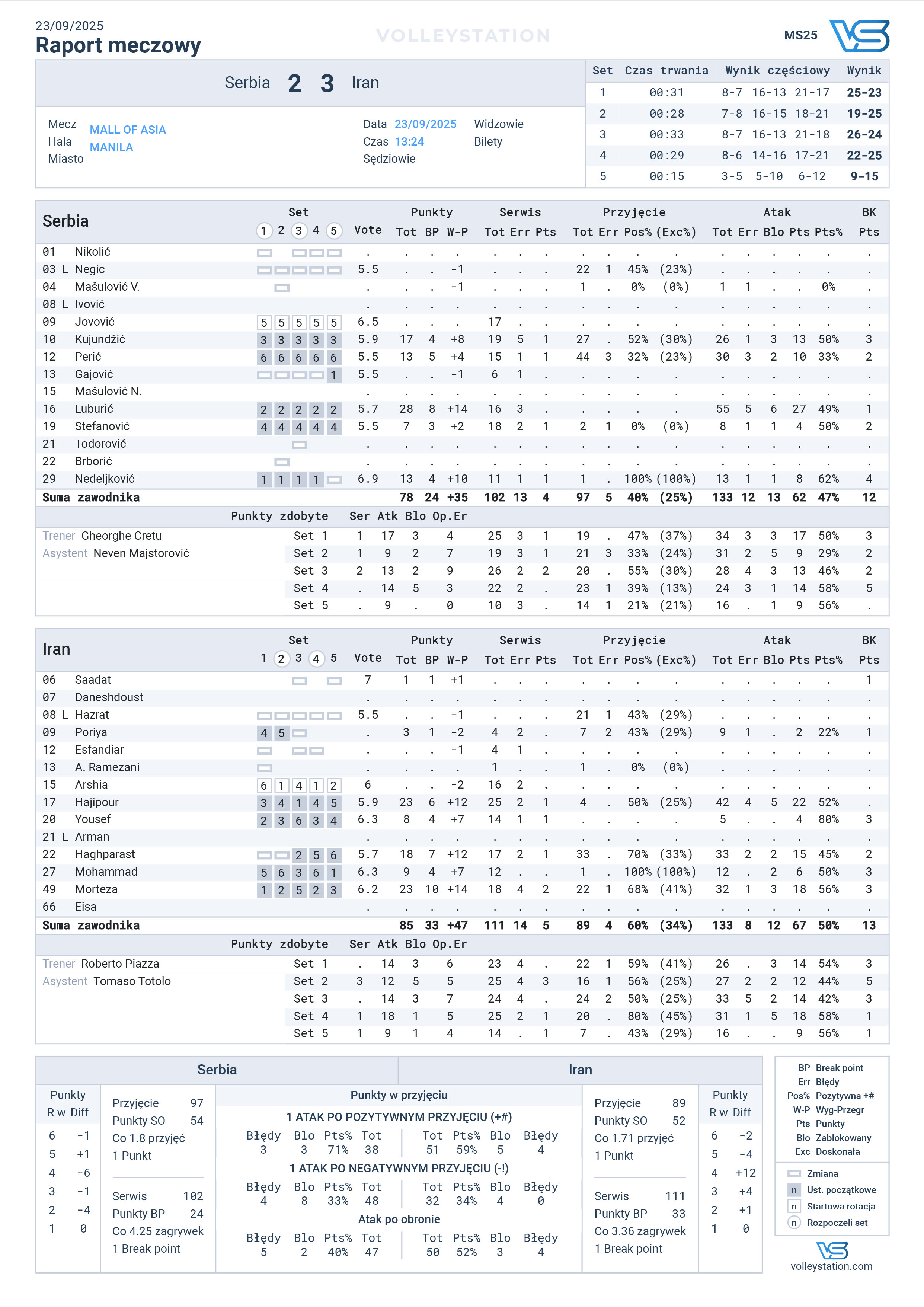Eliminisana je Srbija sa SP posle poraza od Irana, u meču u kome je vodila sa 1:0 i 2:1 u setovima, ali nije uspela da materijalizuje tu prednost. Iranu čestitke na pobedi, a izabranicima Georgea Krecua na borbenosti, želji i onome što su prikazali. Na žalost, to nije bilo dovoljno za nastavak borbe u Manili i ostaje žal, jer je Srbija svakako imala svoje šanse.