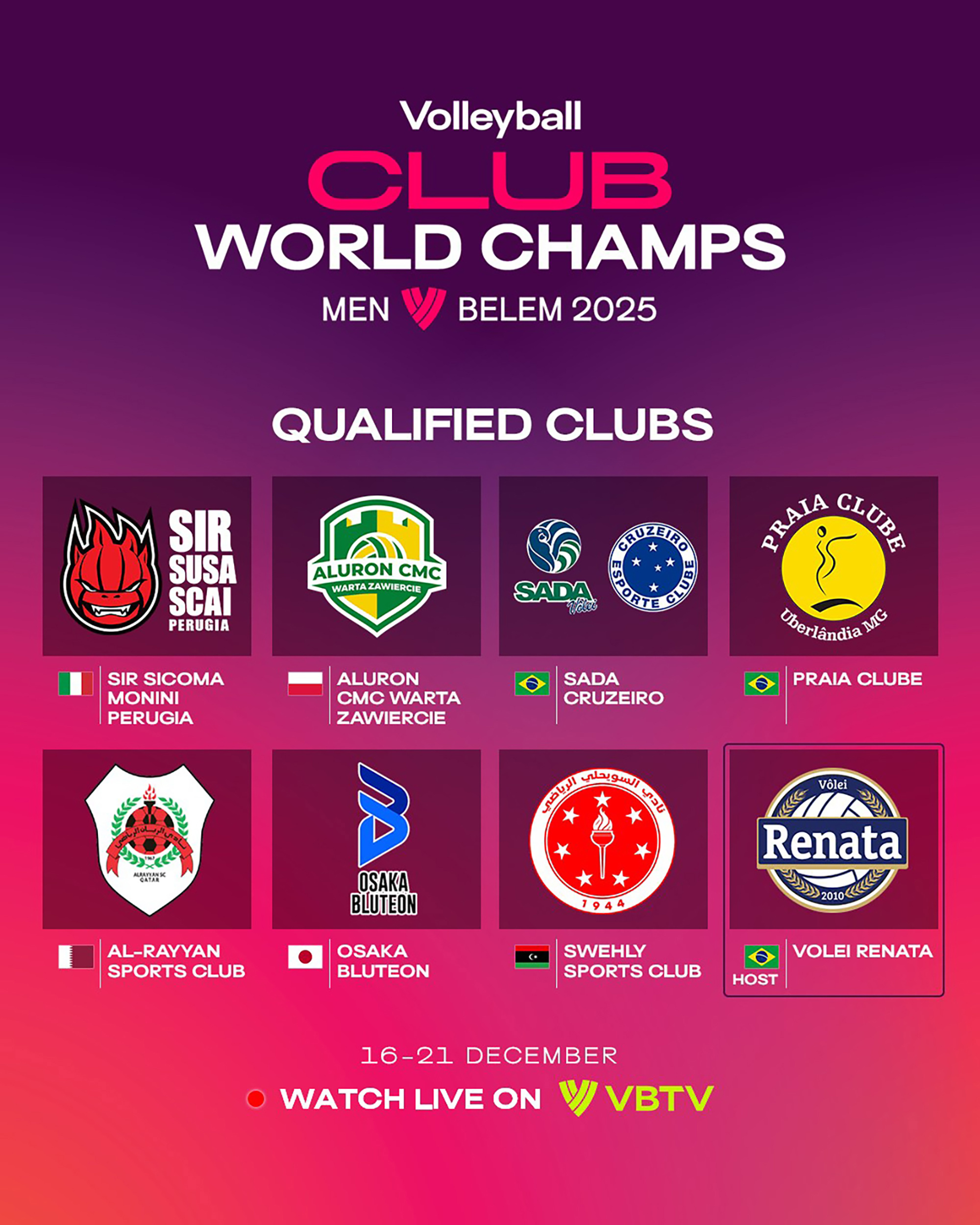 U konkurenciji odbojkaša domaćin je Volej Renata iz Kampinasa, a iz Brazila će još igrati Sada Kruzeiro Kontažem i Praja klub Uberlandija. Pored tri brazilska kluba u Belemu će igrati italijanska Sir Sikoma Monini Peruđa, poljska Aluron Varta Zavjerče, katarski Al Rajan (Miloš Stevanović, Ilija Ivović, Almir Rugovac, kondicioni trener), japanska Osaka Bluteon i libijski Asveli iz Misurate.
