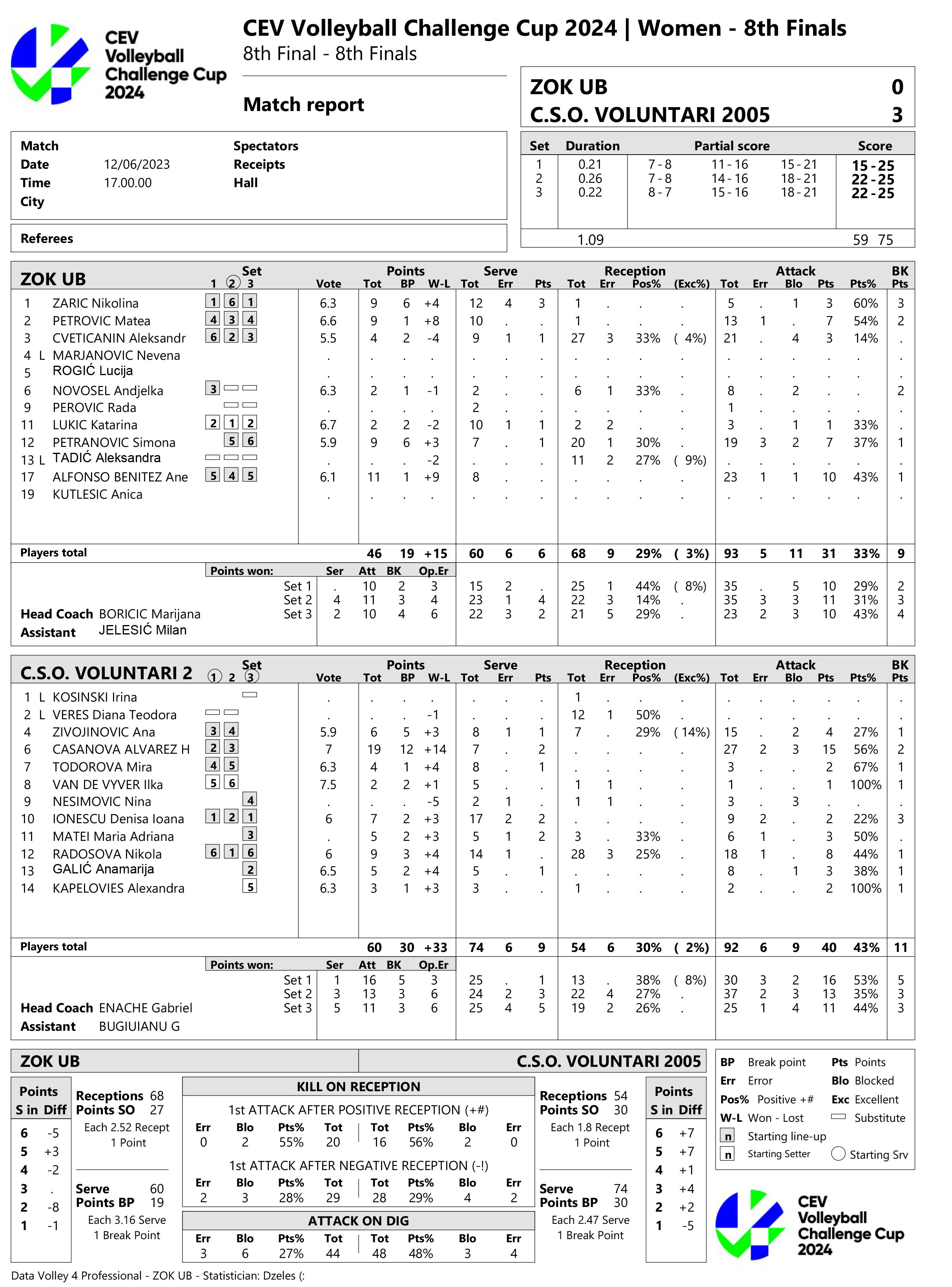Pobednik duela Ub – Voluntari 2005 igraće u četvrtfinalu Kupa izazivača 2024. (10 i 17. januara) protiv pobednika dvomeča između grčkog Olimpijakosa iz Pireja, za koji igra Milica Kubura, i italijanske Novare.