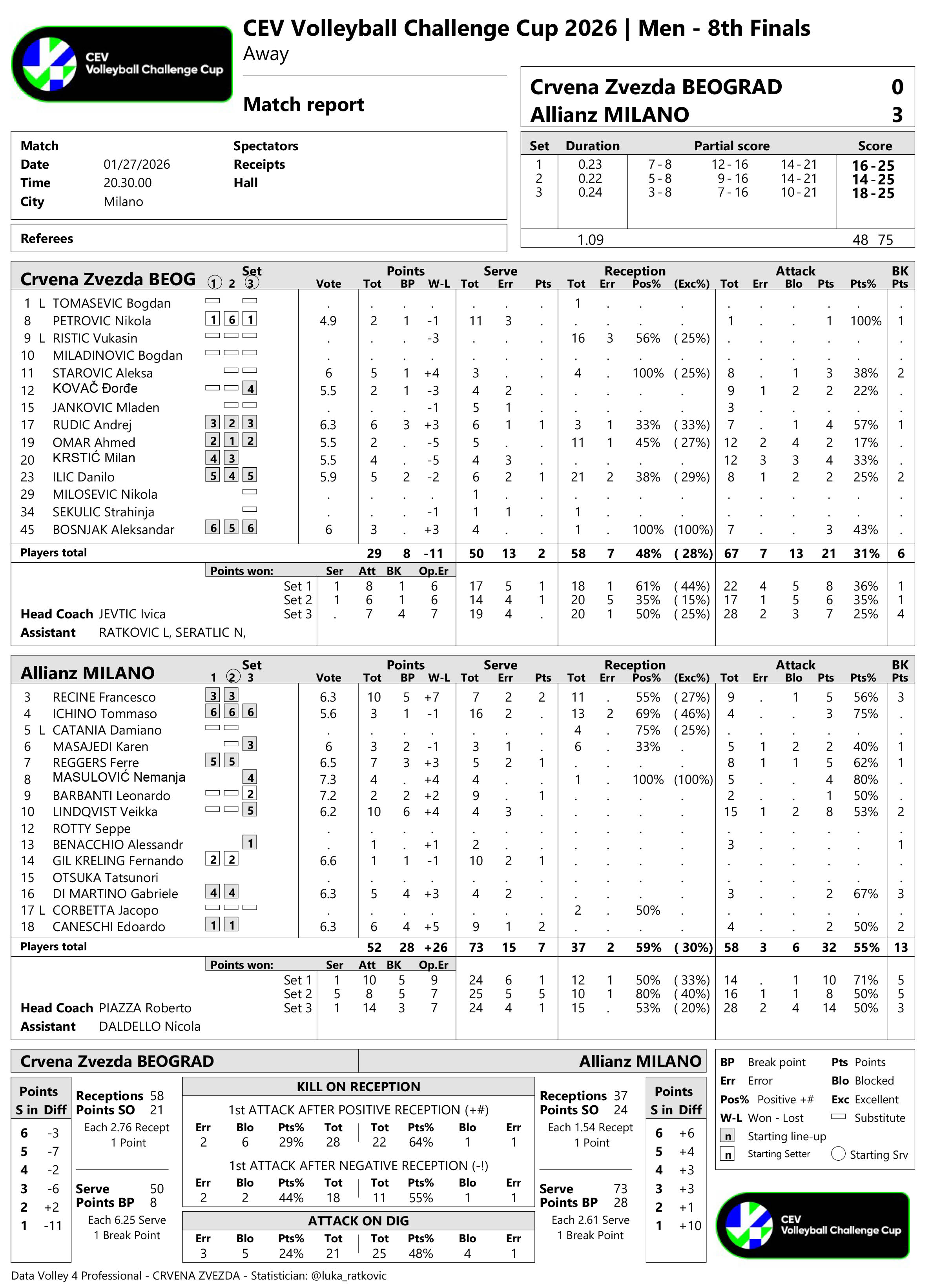 Pobednik duela Crvena zvezda – Alijanc Milano igraće u četvrtfinalu (11. i 18. februar) protiv pobednika dvomeča između španske Valensije i poljske Čestohove, koju sa klupe predvodi Ljuba Travica. U prvom meču, odigranom u Španiji, Čestohova je pobedila sa 3:0 (25:20, 25:22, 25:22). Revanš će se odigrati u četvrtak, 29. januara od 20.30 časova u Poljskoj.