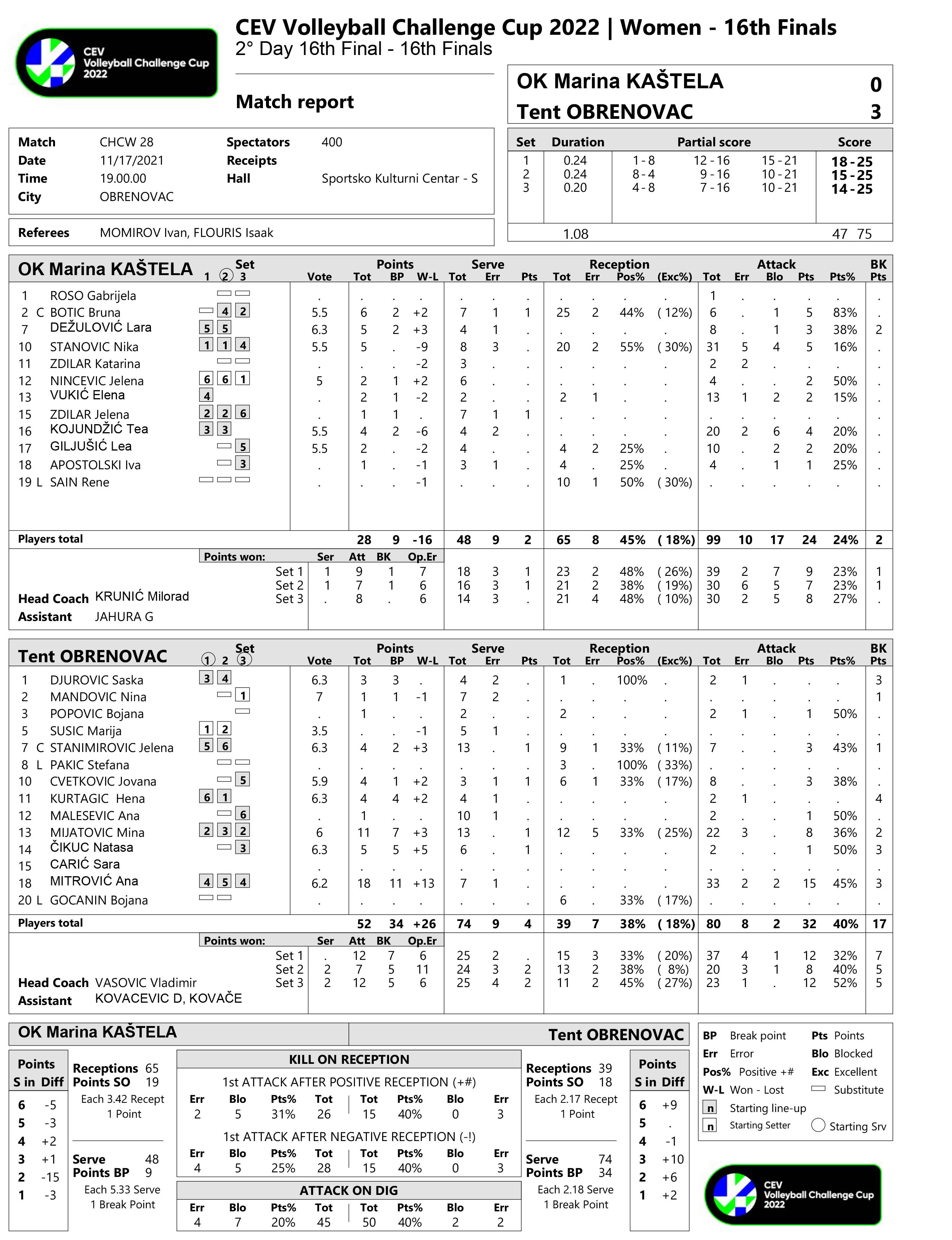 U prvoj utakmici, odigranoj sinoć u Obrenovcu, TENT je pobedio gošće iz Kaštele sa 3:1 (16:25, 25:19, 25:19, 25:14).