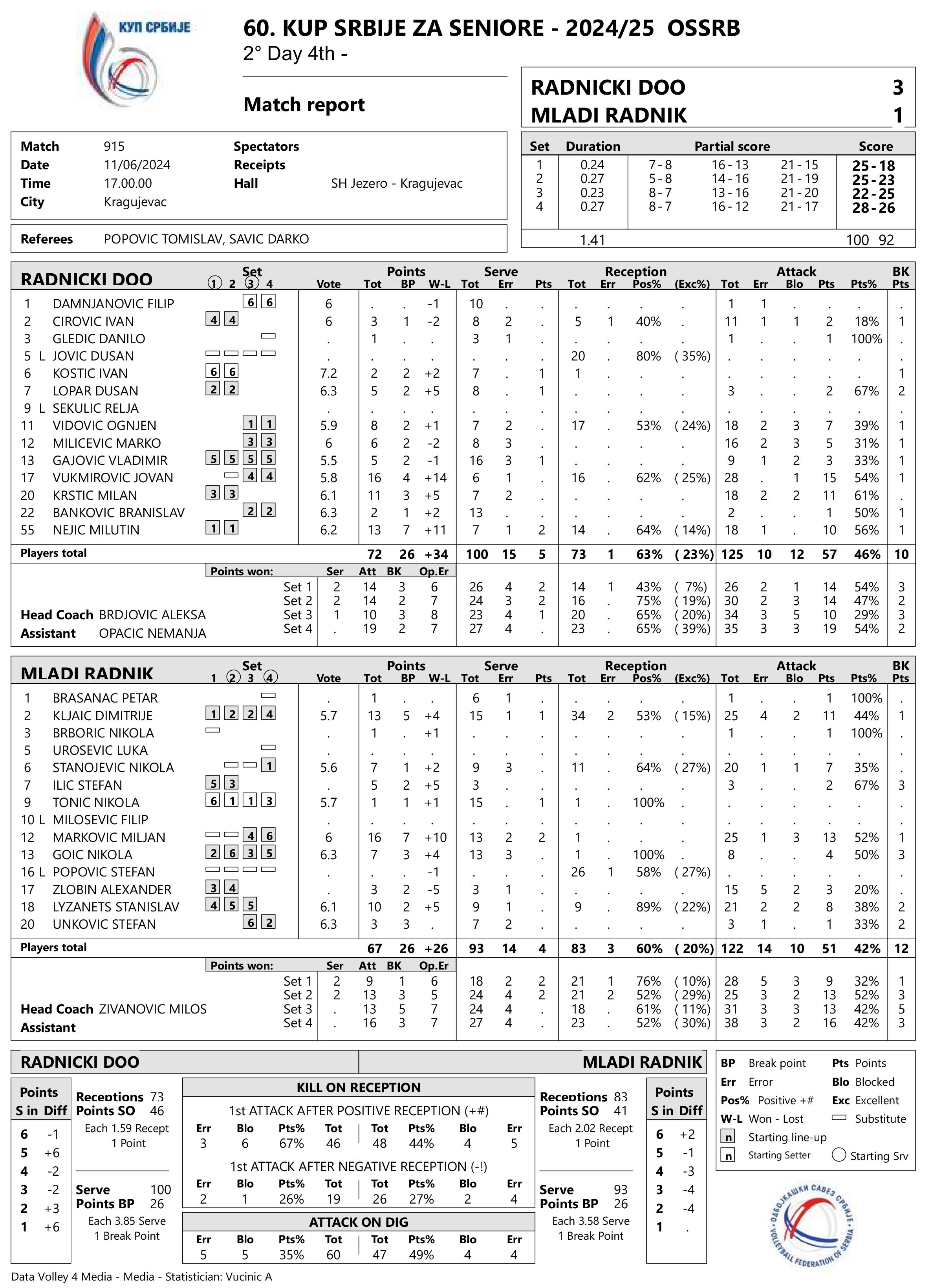 RADNIČKI DOO (KRAGUJEVAC) – MLADI RADNIK (POŽAREVAC) 3:1 (25:18, 25:23, 22:25, 28:26)