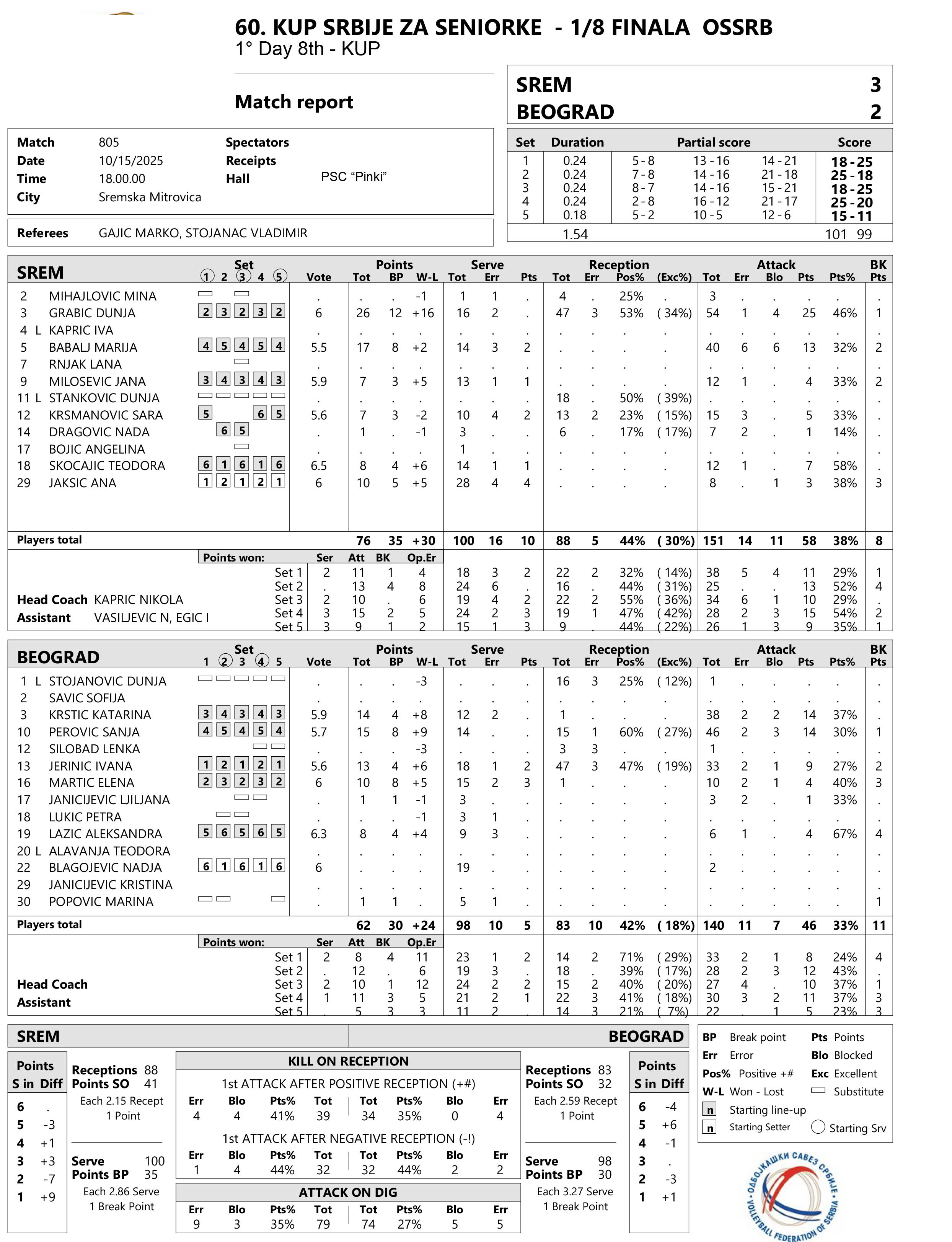 SREM (SREMSKA MITROVICA) – BEOGRAD 3:2 (18:25, 25:18, 18:25, 25:20, 15:11)