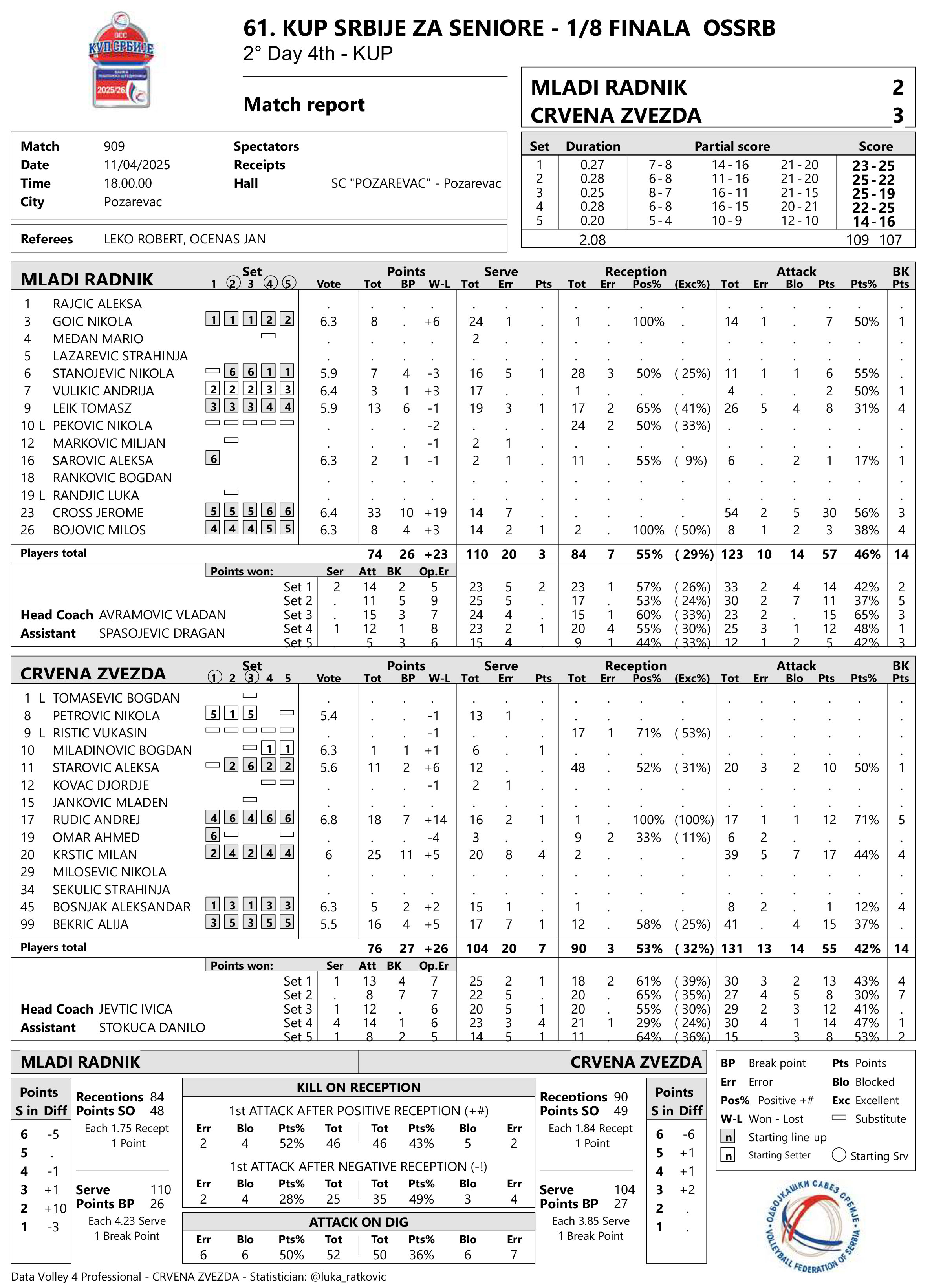 MLADI RADNIK (POŽAREVAC) – CRVENA ZVEZDA 2:3 (23:25, 25:22, 25:19, 22:25, 14:16)