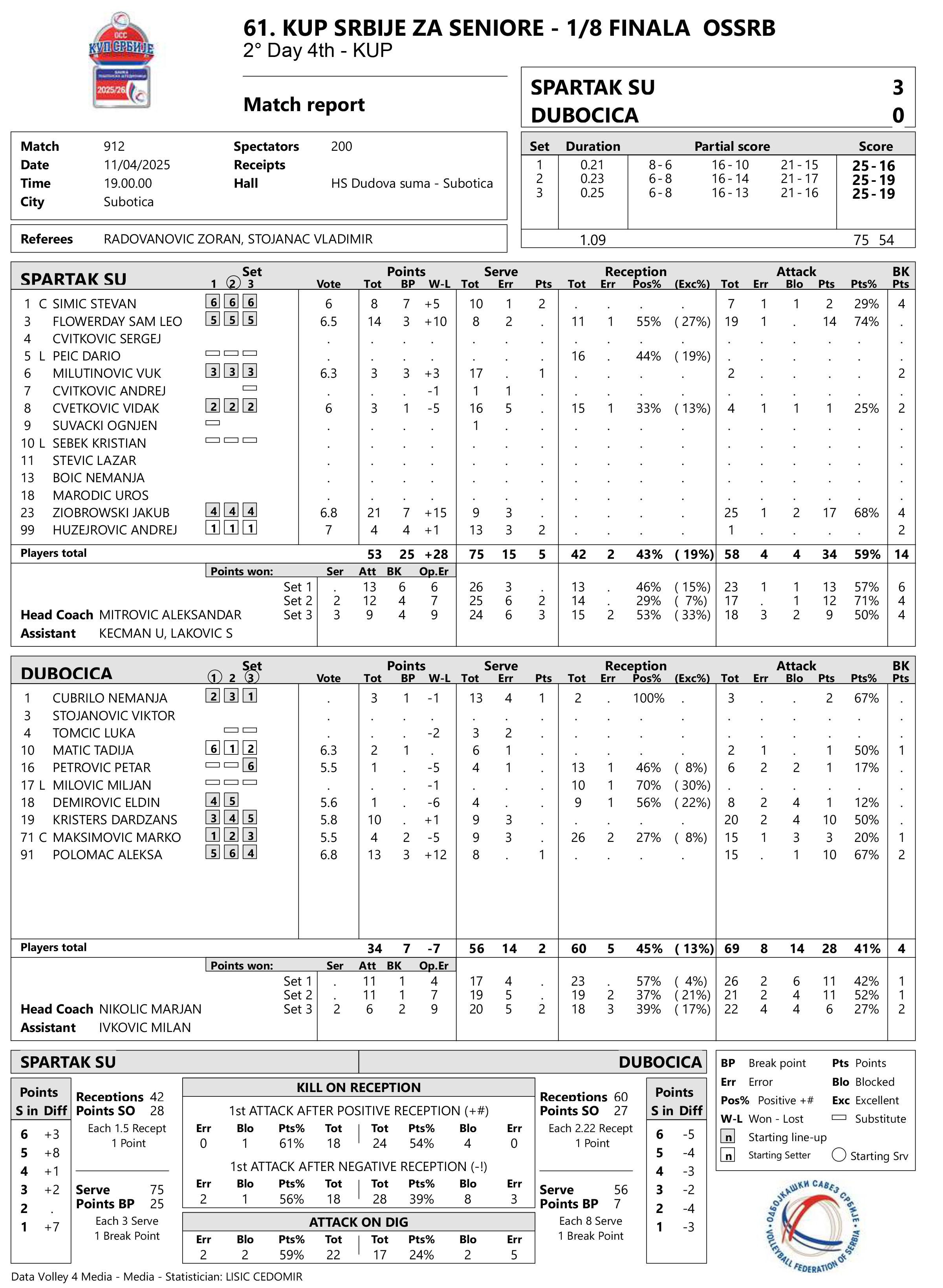 SPARTAK (SUBOTICA) – DUBOČICA (LESKOVAC) 3:0 (25:16, 25:19, 25:19)