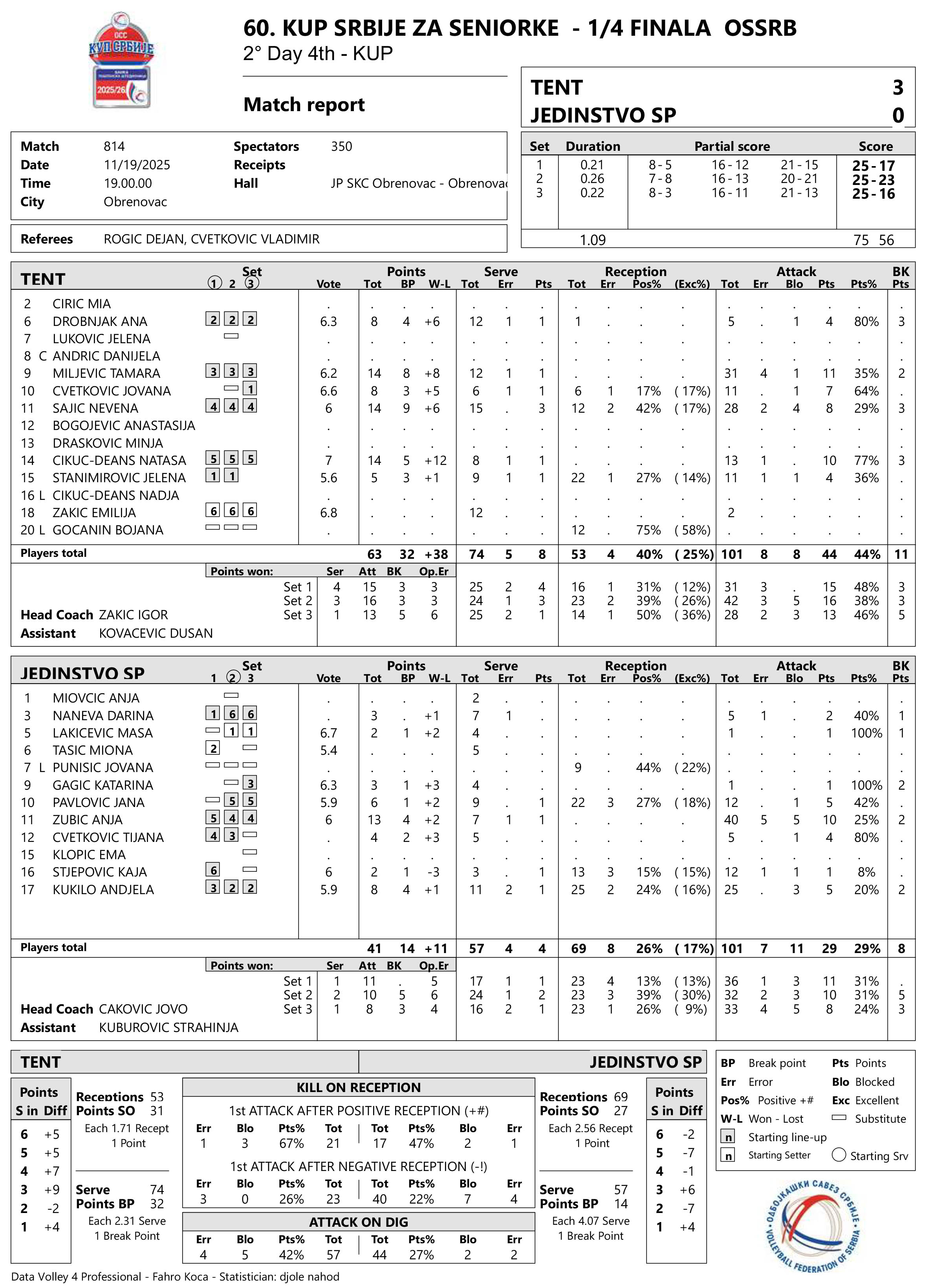 TENT (OBRENOVAC) – JEDINSTVO (STARA PAZOVA) 3:0 (25:17, 25:23, 25:16) – „ZLATNI SET“: 15:11