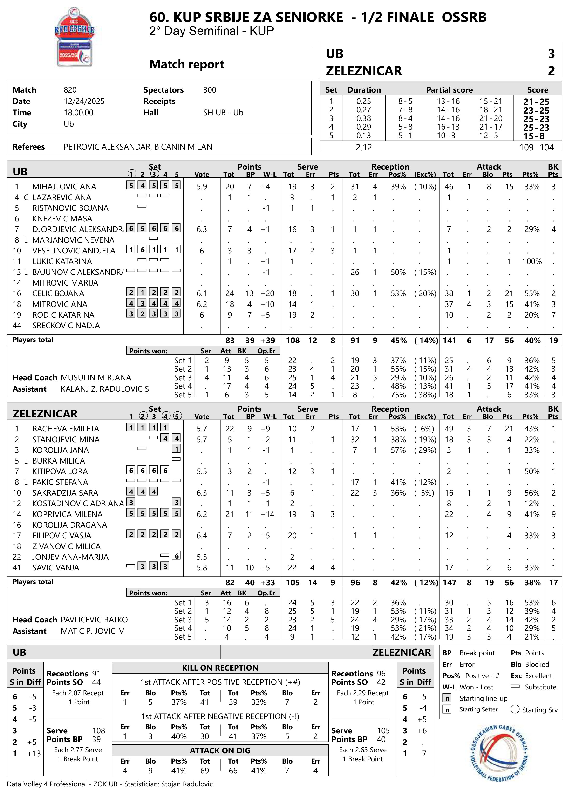 UB – ŽELEZNIČAR (LAJKOVAC) 3:2 (21:25, 23:25, 25:23, 25:23, 15:8)