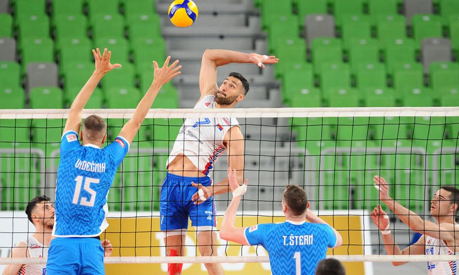 U drugoj utakmici 2. kola, Srbija je savladala Sloveniju A sa 2:1, po setovima 16:25, 25:23 i 25:18, posle 70 minuta igre.