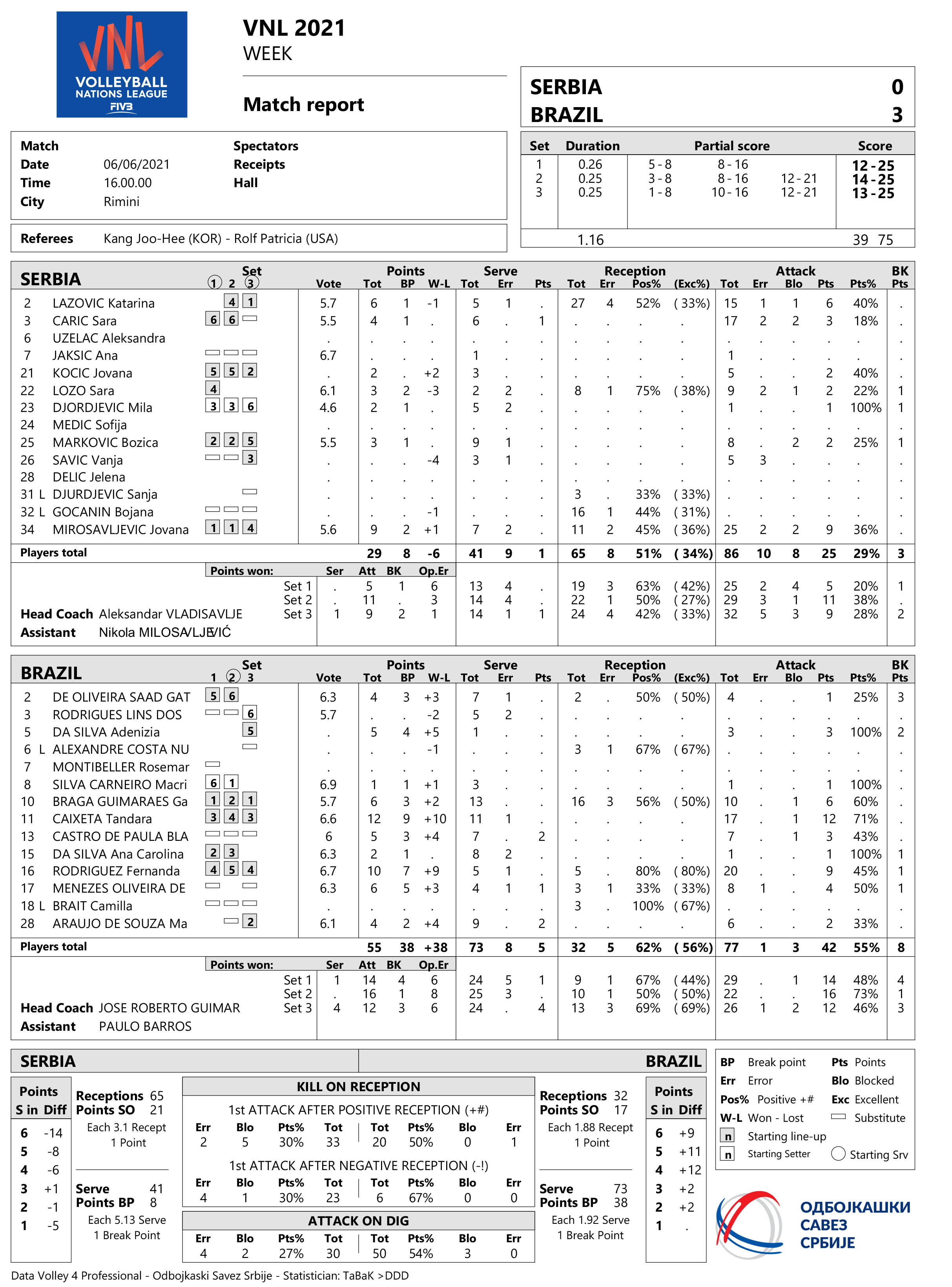 Iskusnije i kvalitetnije Brazilke nisu propustile šansu da ubedljivo savladaju mlade izabranice Aleksandra Vladisavljeva. Brazil, koji u Riminiju igra u najjačem sastavu, nijednog trenutka nije dozvolio Srbiji da pokuša da se rezultatski vrati u meč. Od početka sva tri seta Brazilke su bile silovite, što pokazuje i konačan rezultat. Odbojkašicama Srbije se nema šta zameriti, jer su igrale protiv daleko kvalitetnijeg rivala, a priliku za bolje izdanje imaće u naredna dva kola III vikenda.