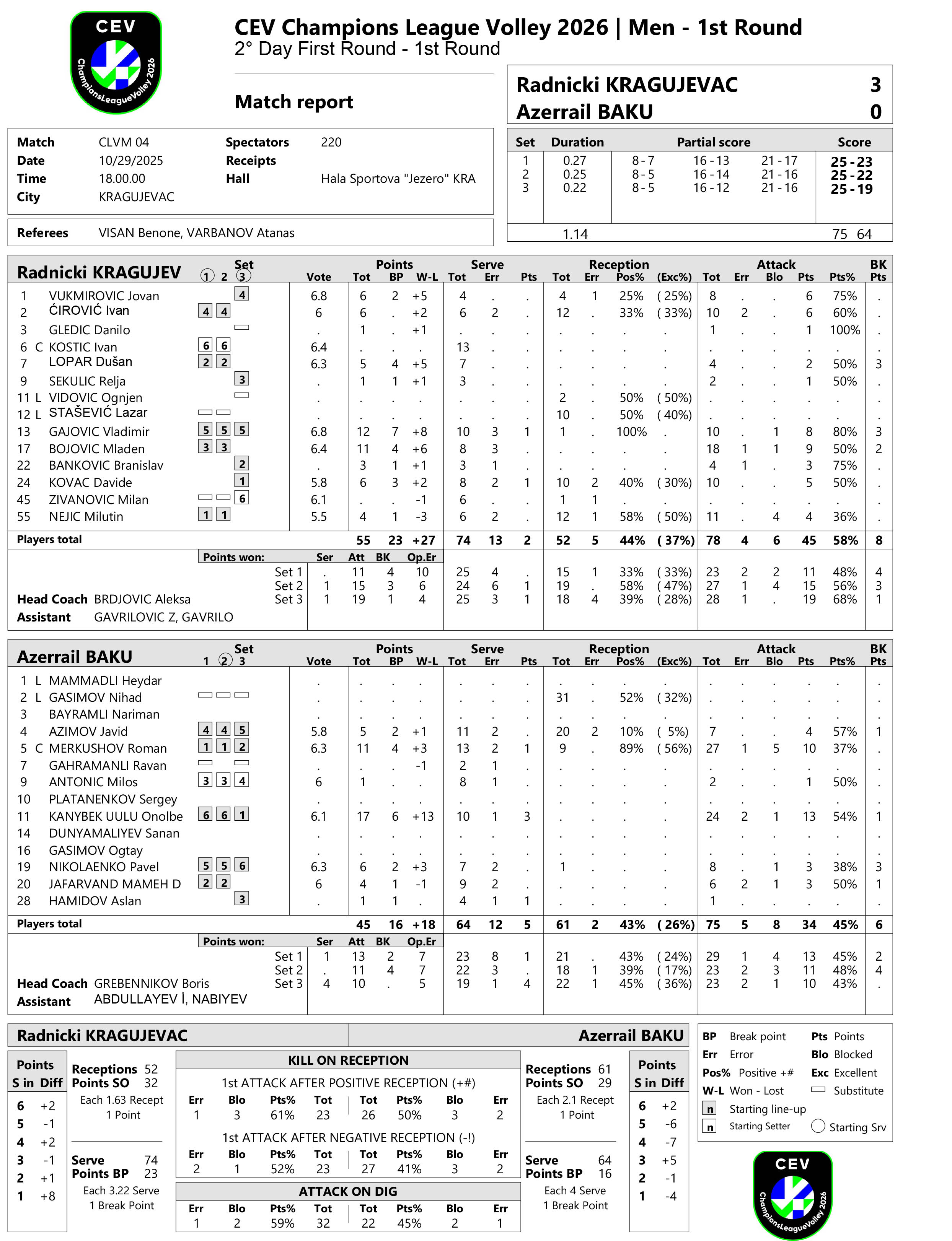 U prvoj utakmici, odigranoj u Bakuu, Radnički doo je slavio sa 3:0 (25:21, 25:18, 25:22).