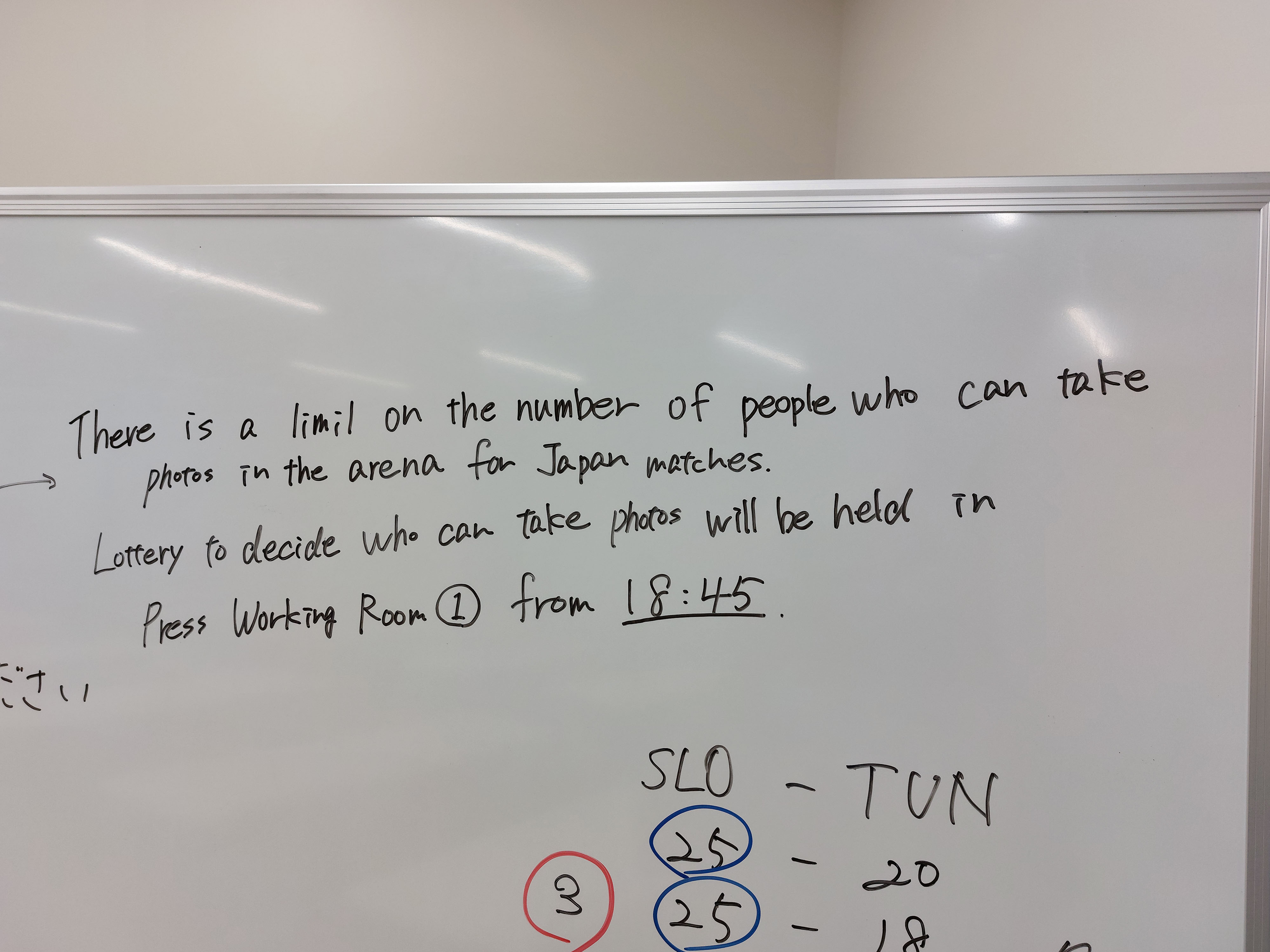 Za utakmice Japana od prvog dana vlada najveće interesovanje, ne samo gledalaca, već i medija. Tako su domaćini turnira u pres centru istakli obaveštenje da zbog ograničenog broja mesta za fotoreportere neće svi moći da fotografišu mečeve Japana, već će pre svake utakmice, u 18.45 časova po lokalnom vremenu biti organizovana lutrija za fotografisanje mečeva odbojkaša Japana, koji sve svoje utakmice igraju od 19.25 časova po lokalnom, odnosno 12.25 časova po našem vremenu.