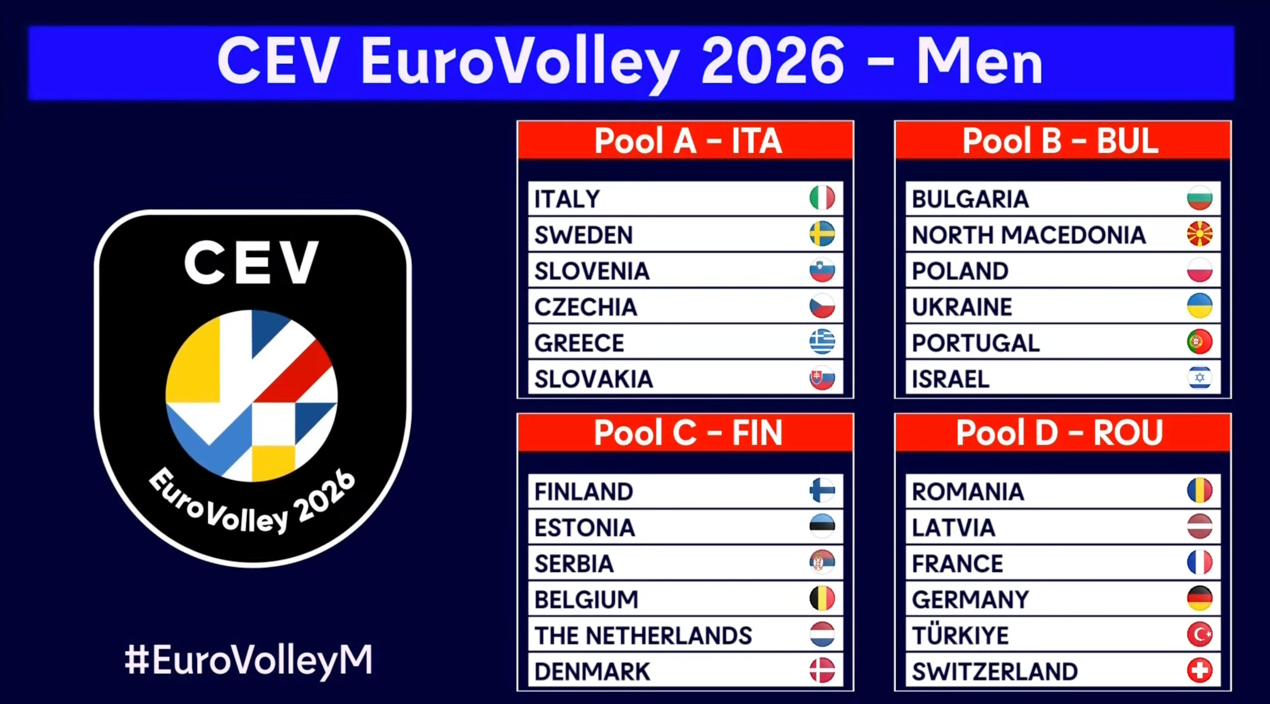Plasman na XXXIV EP 2026. u konkurenciji odbojkaša izborili su Italija, Bugarska, Rumunija, Finska, Srbija, Poljska, Slovenija, Francuska, Holandija, Ukrajina, Nemačka, Portugalija, Danska, Belgija, Češka, Estonija, Švajcarska, Grčka, Slovačka, Letonija, Turska, Izrael, Švedska i Severna Makedonija.