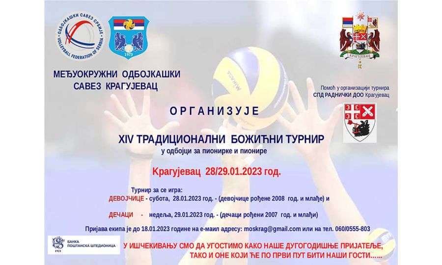 Posle dve godine pauze odigraće se tradicionalni, XIV Božićni turnir 2023. u konkurenciji pionirki i pionira. Turnir će se odigrati se 28. i 29. januara u Kragujevcu u organizaciji Međuokružnog odbojkaškog saveza Kragujevac, uz pomoć SPD Radnički doo iz Kragujevca.